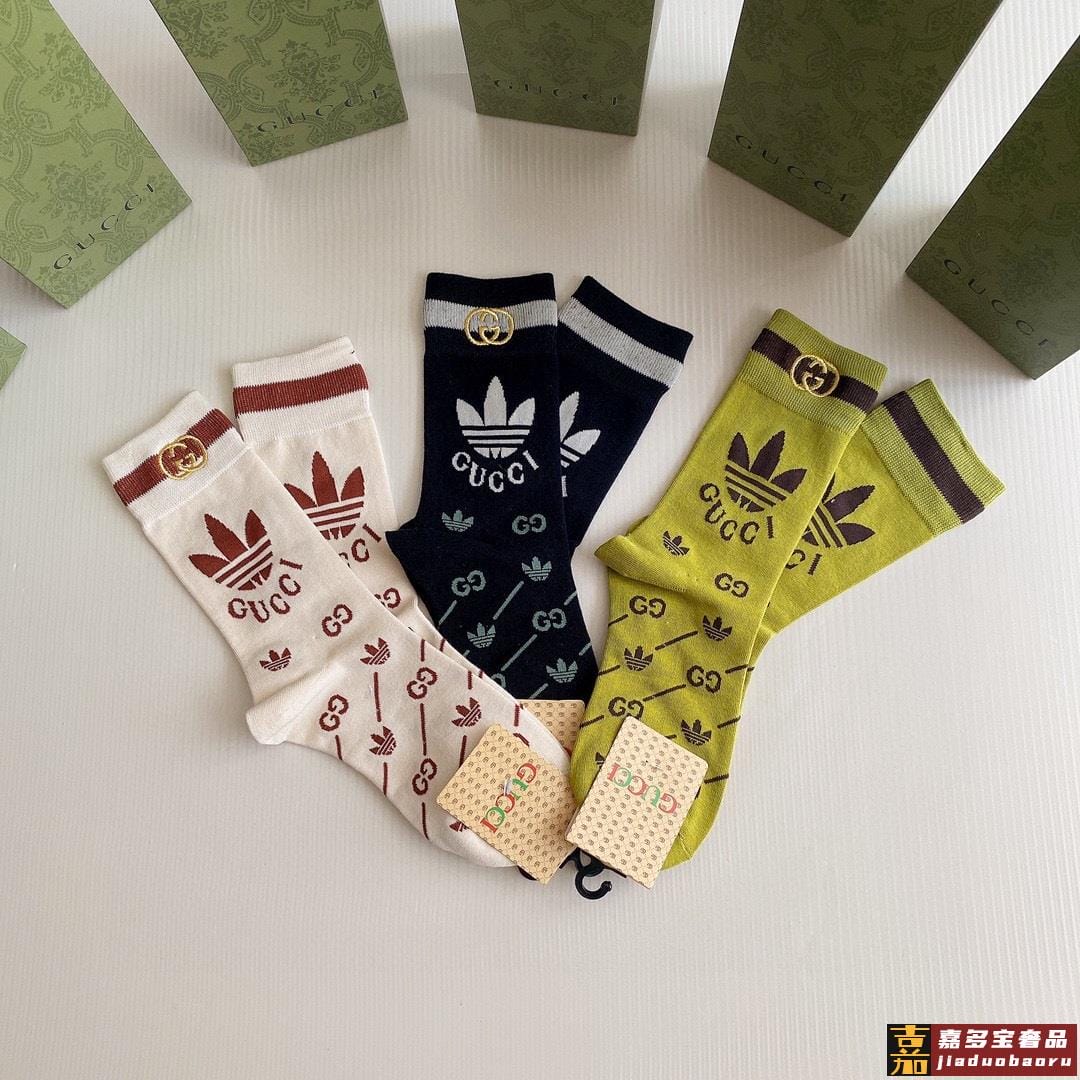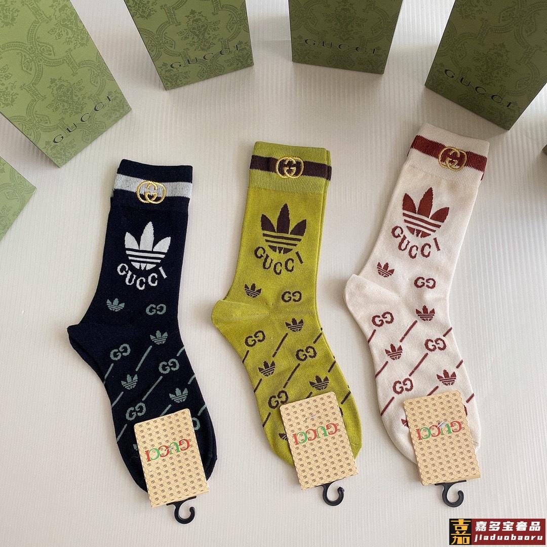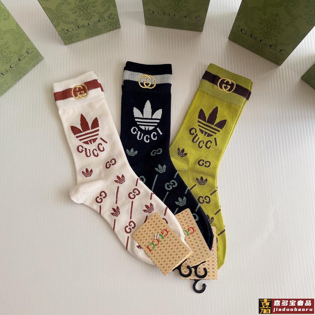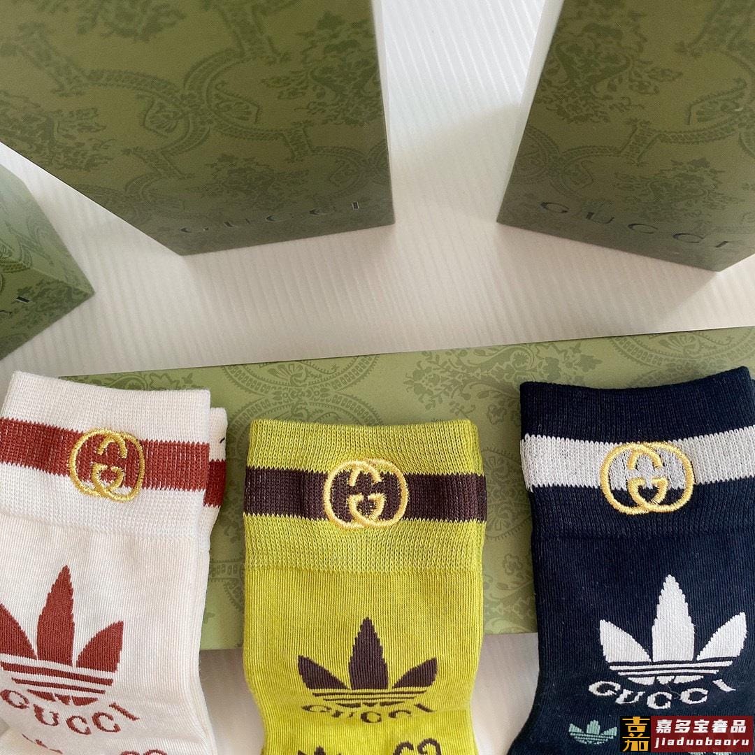 特配包装古驰新款经典三叶草联名中长款刺绣堆堆袜袜子一盒三双专