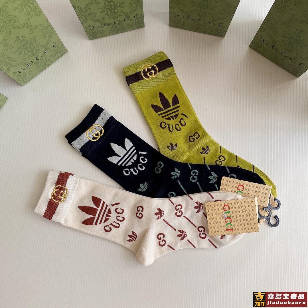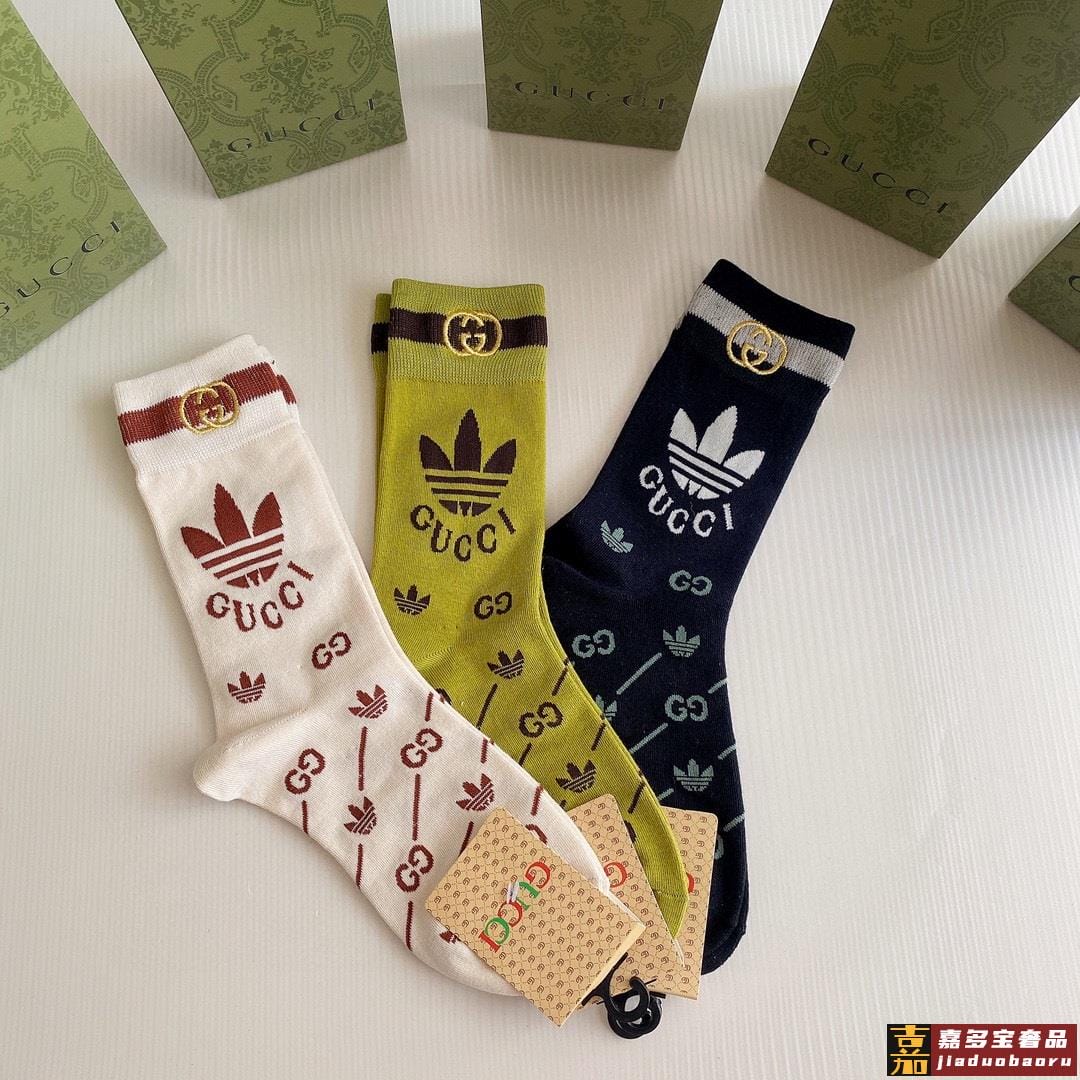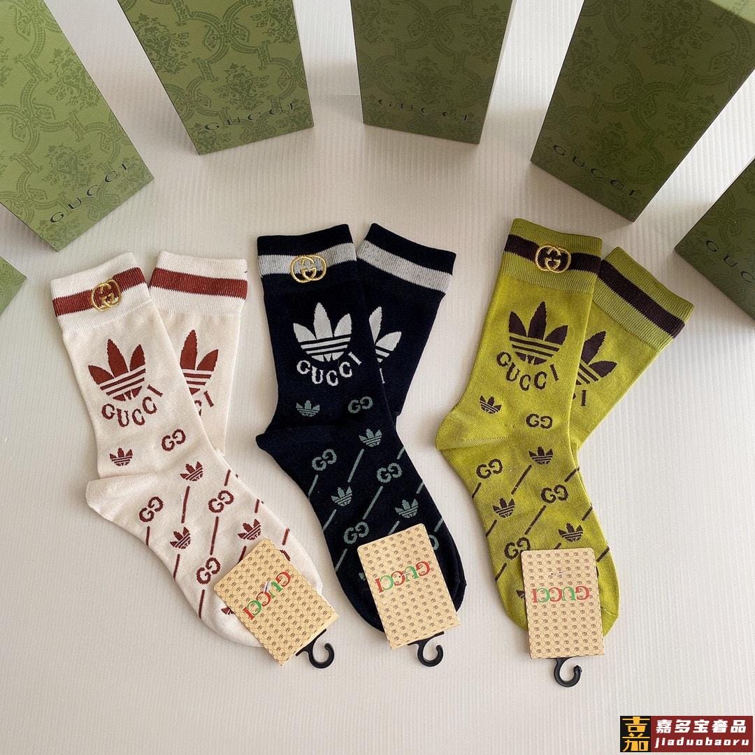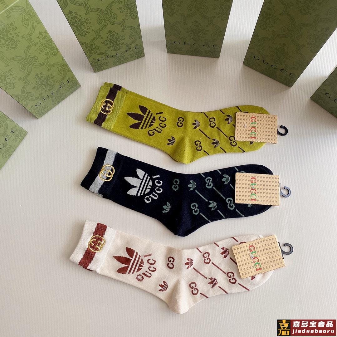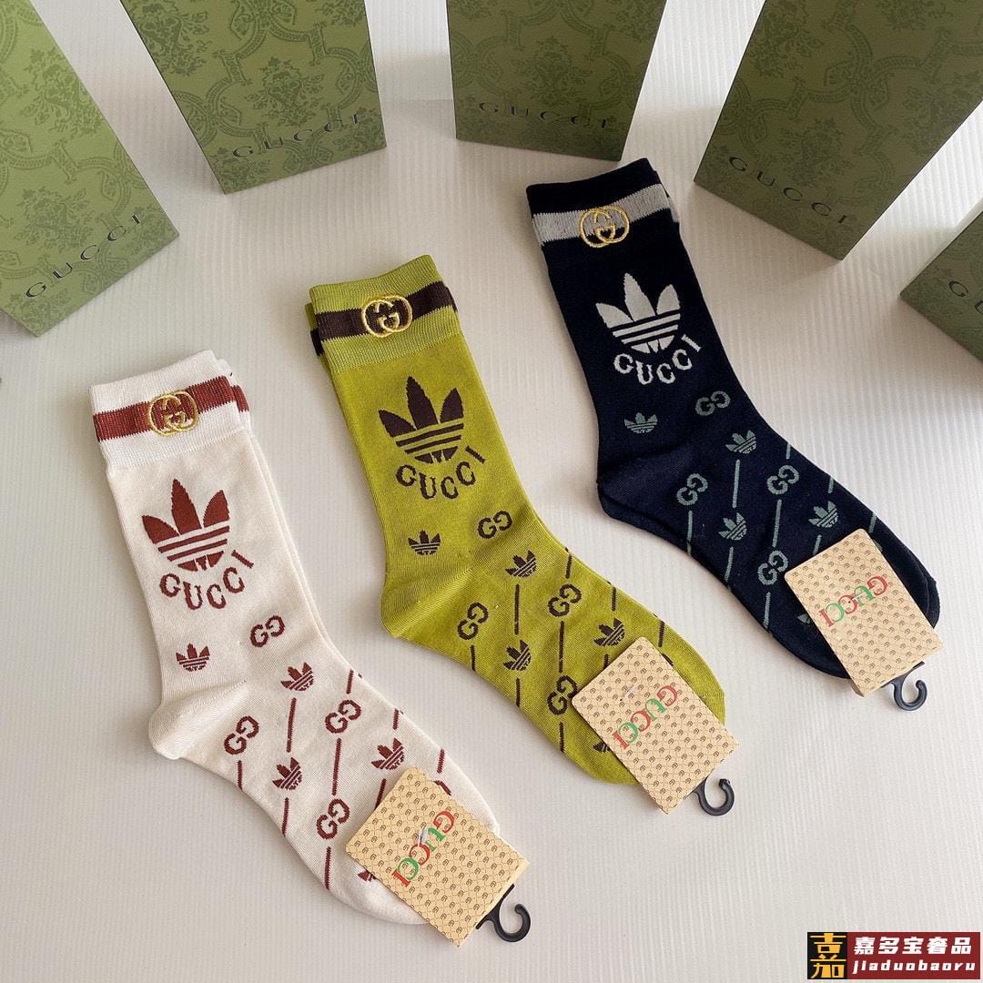 特配包装古驰新款经典三叶草联名中长款刺绣堆堆袜袜子一盒三双专