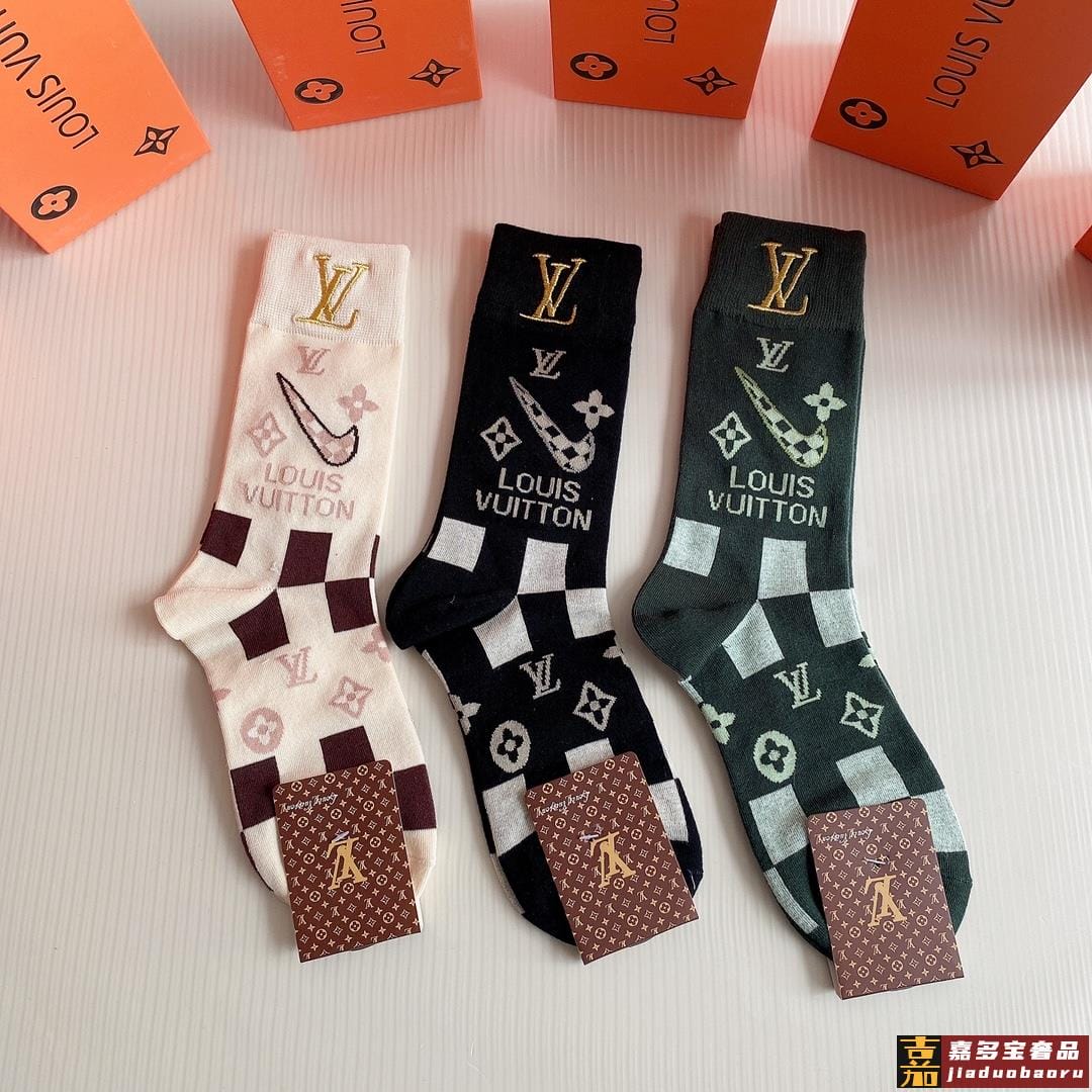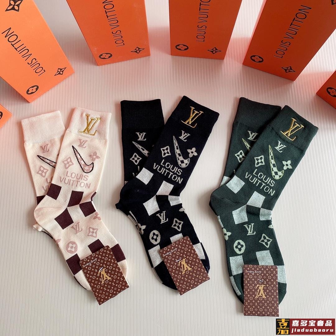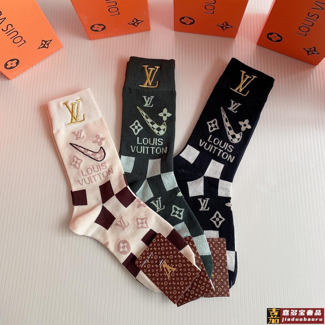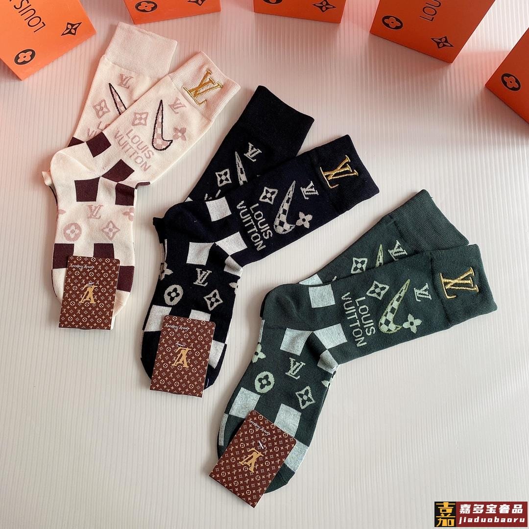 特配包装路易威登新款经典中长款刺绣堆堆袜袜子一盒三双专柜同步