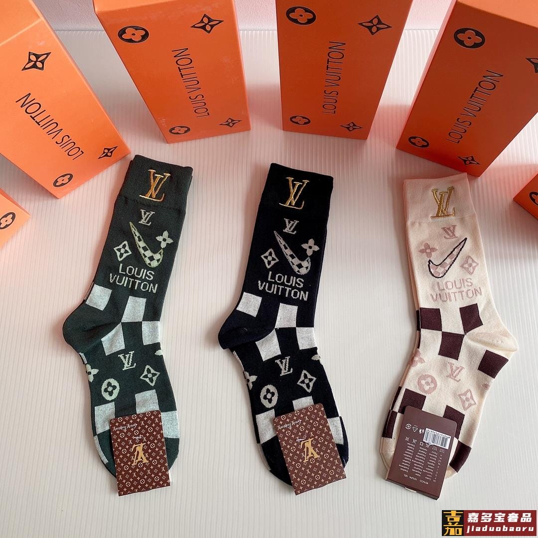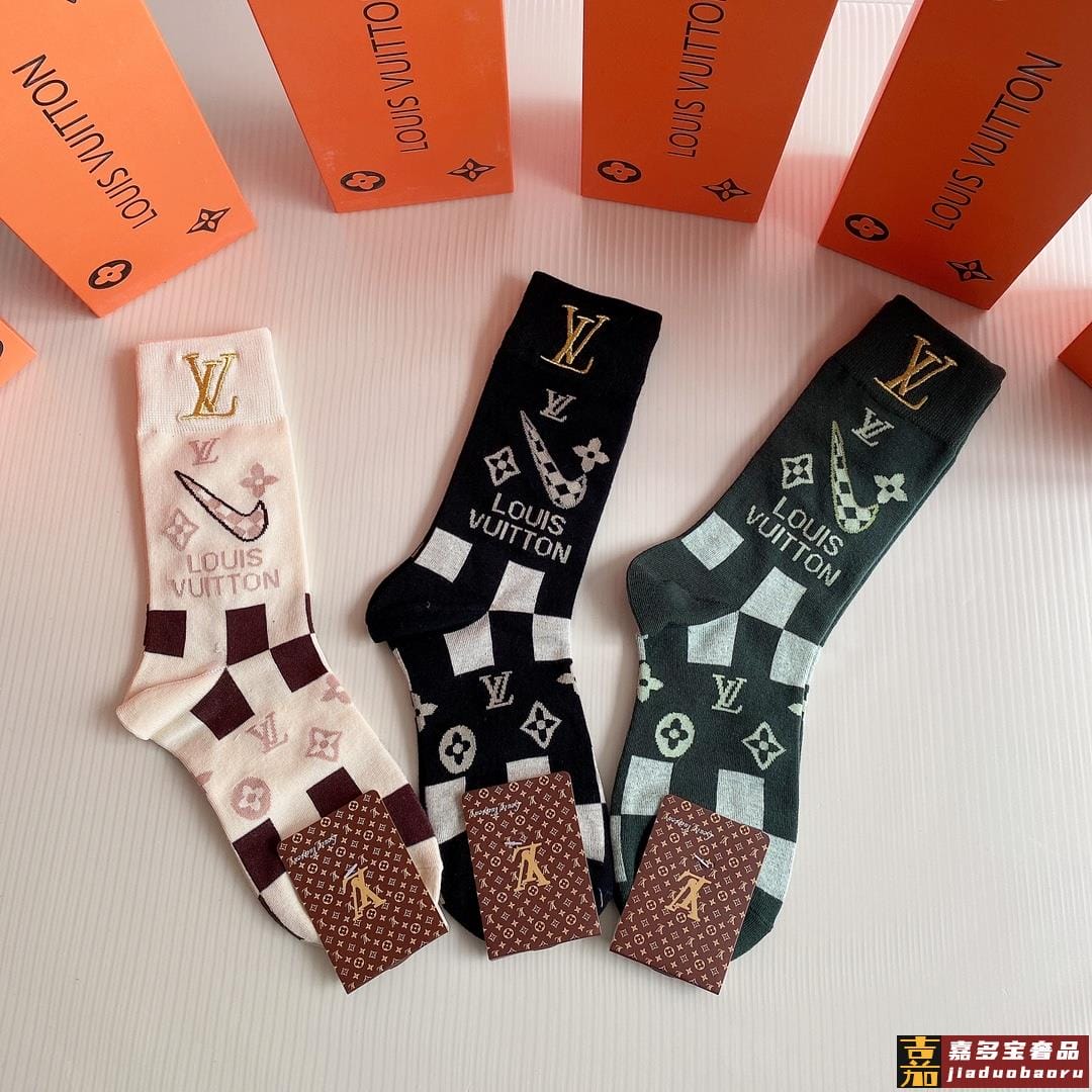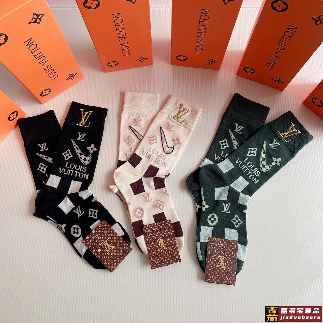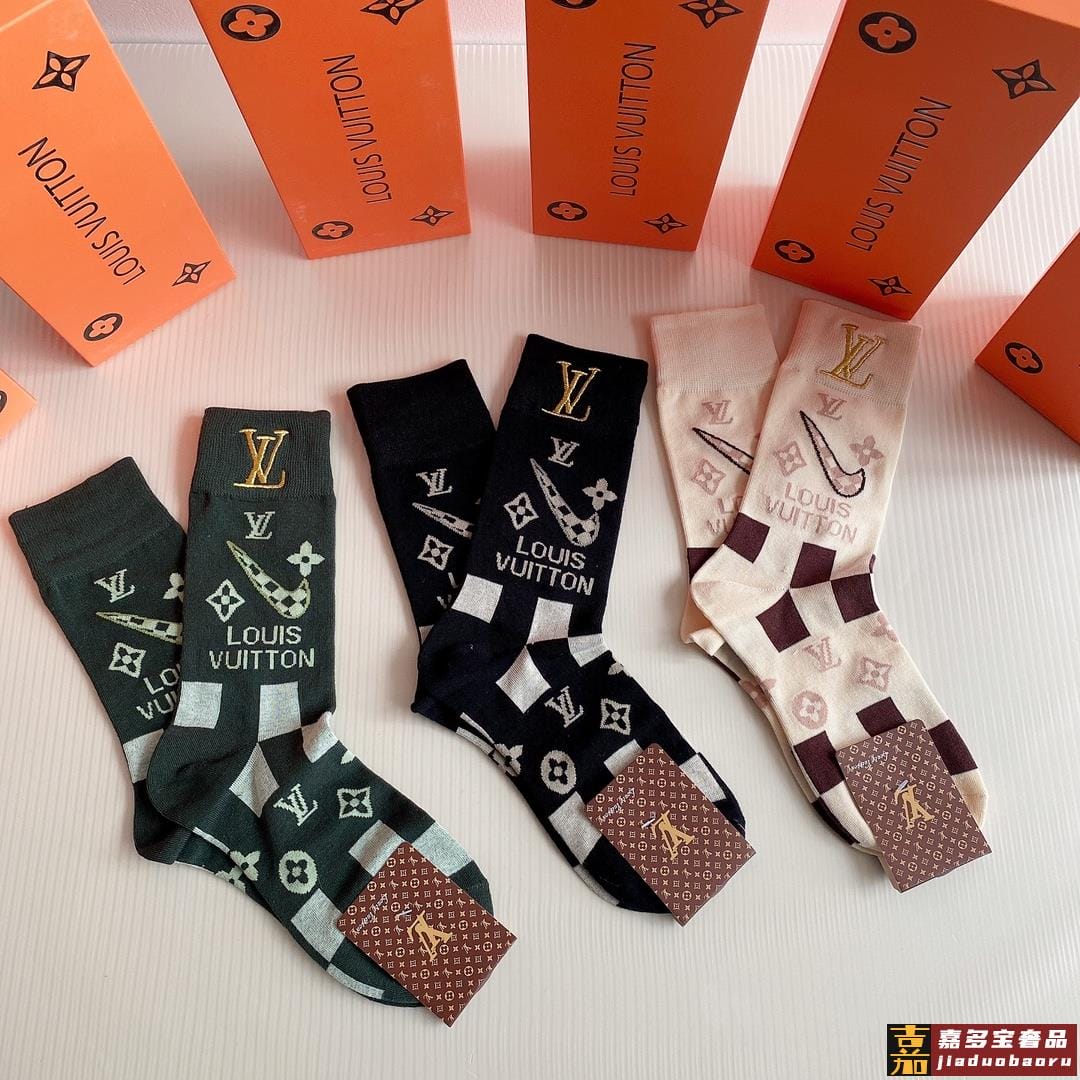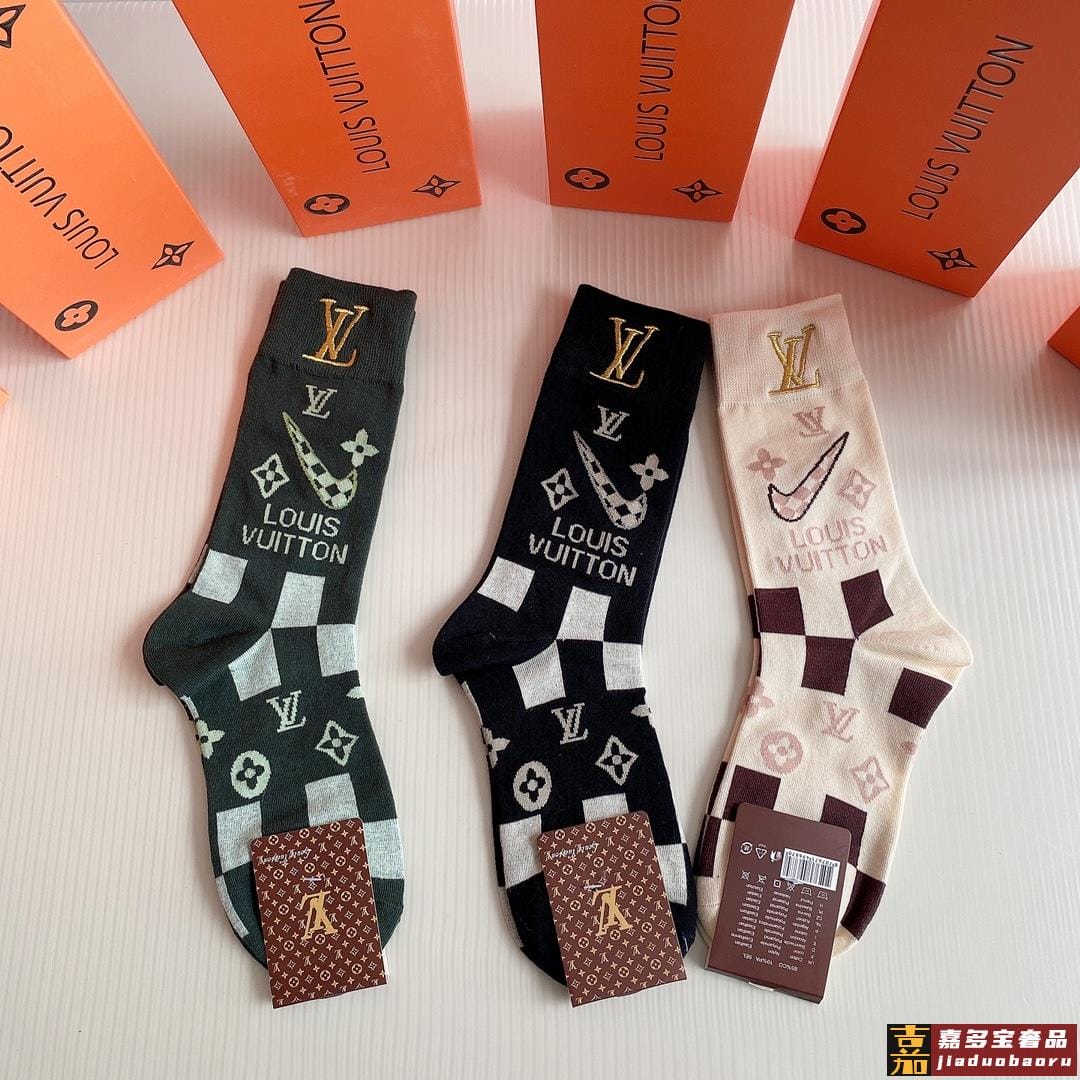 特配包装路易威登新款经典中长款刺绣堆堆袜袜子一盒三双专柜同步