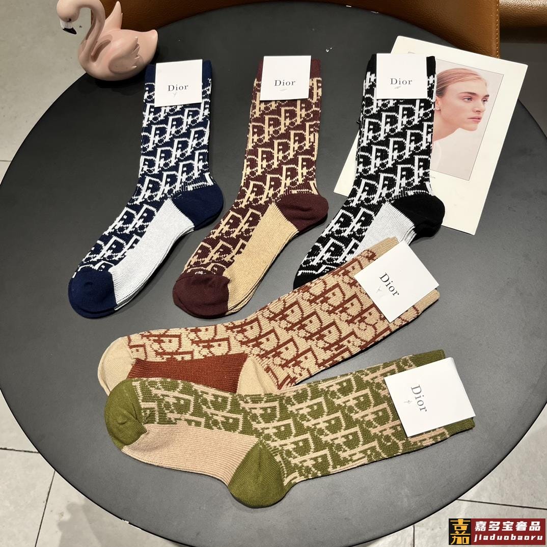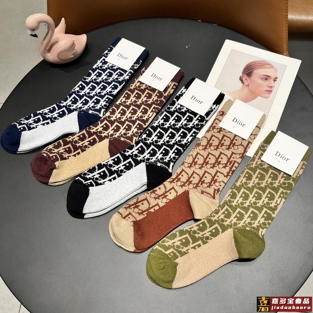 一盒五双迪奥新款刺绣中长款袜子罗口刺绣品牌简称字母装饰专柜同