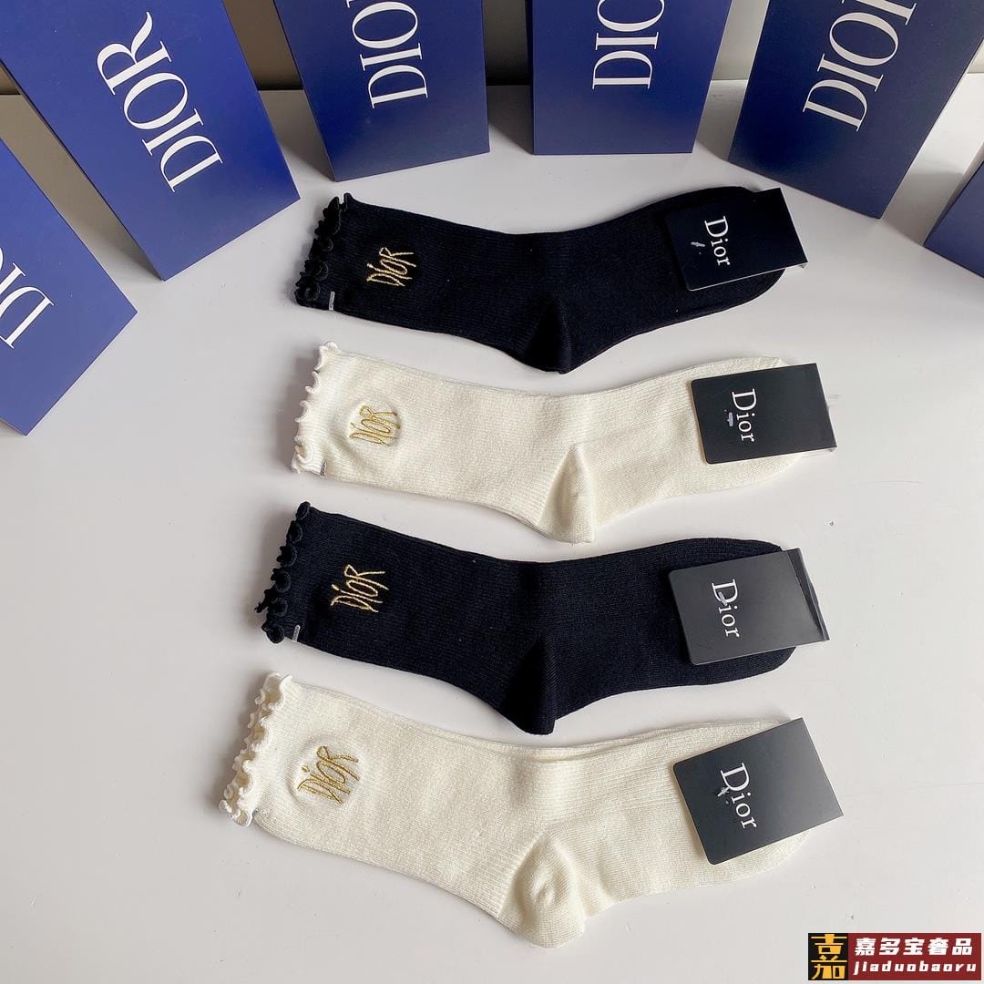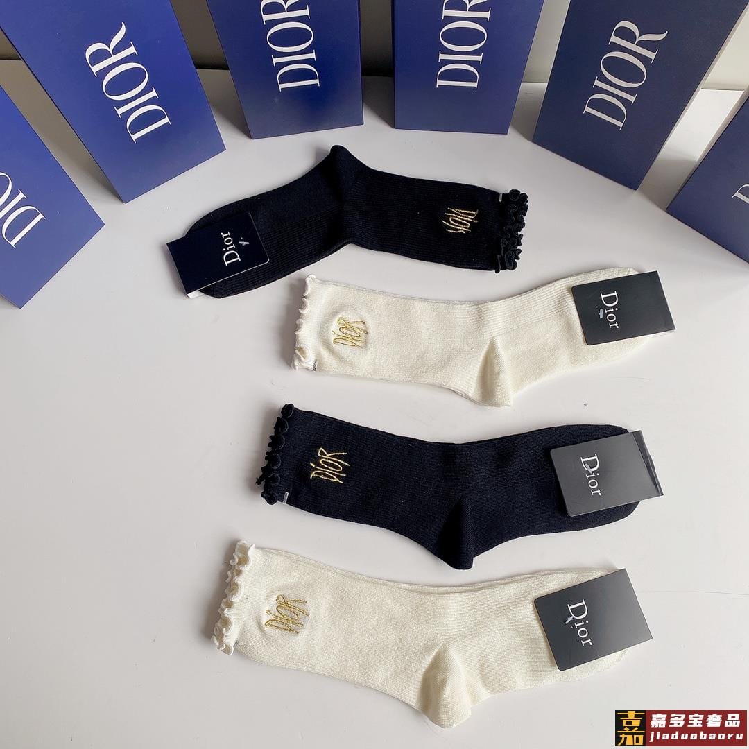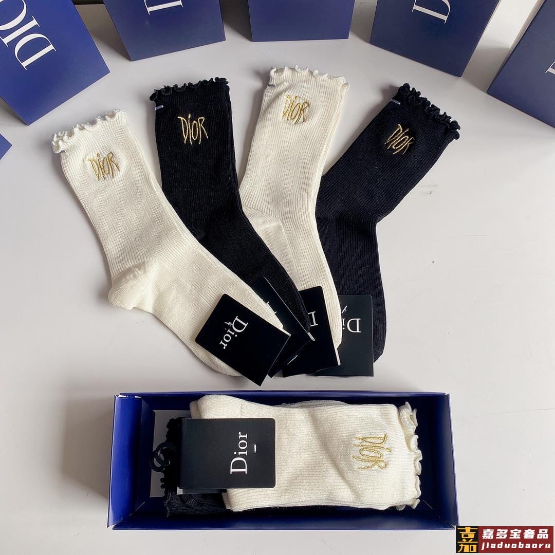 特配专柜包装迪奥新款中长款刺绣毛边堆堆袜袜子一盒四双专柜同步