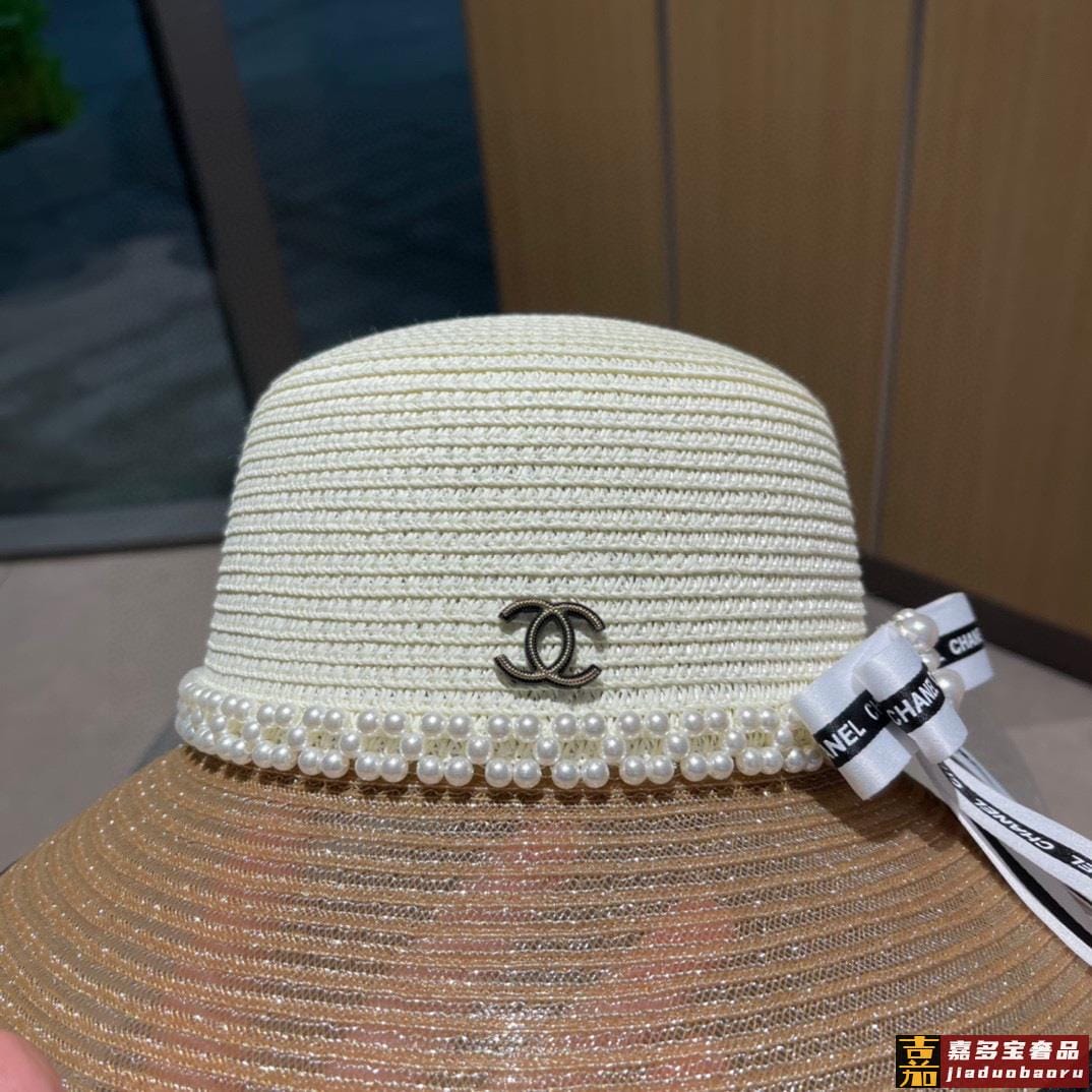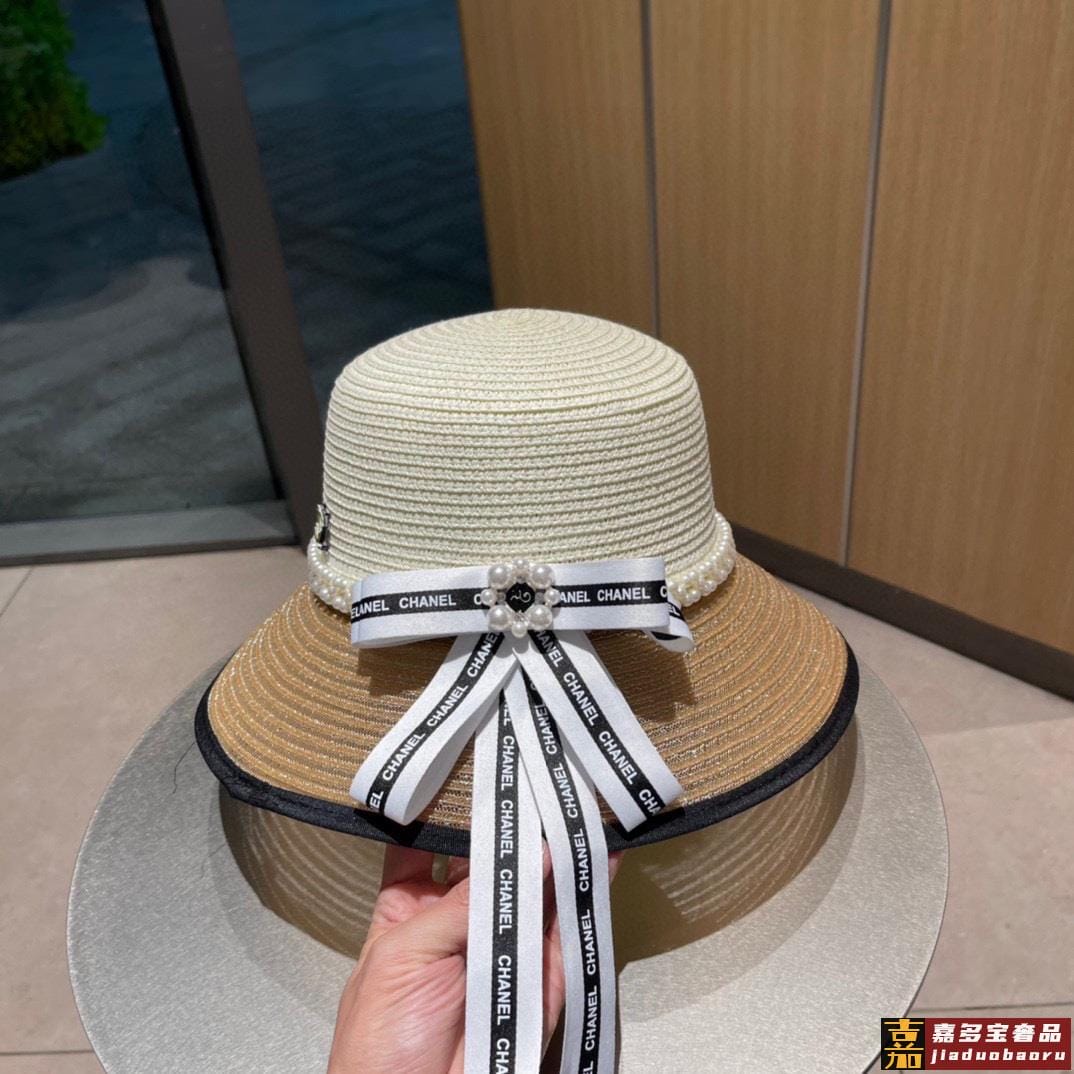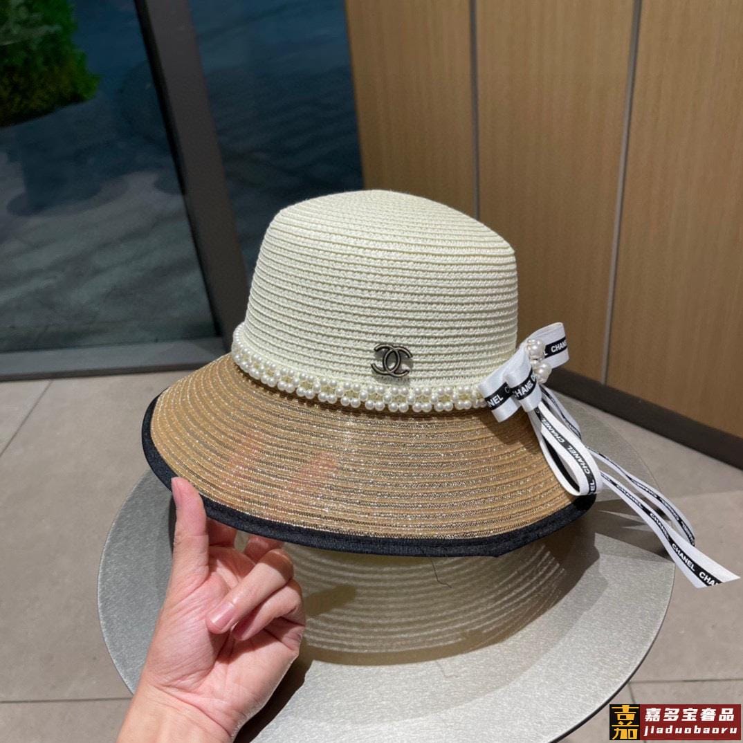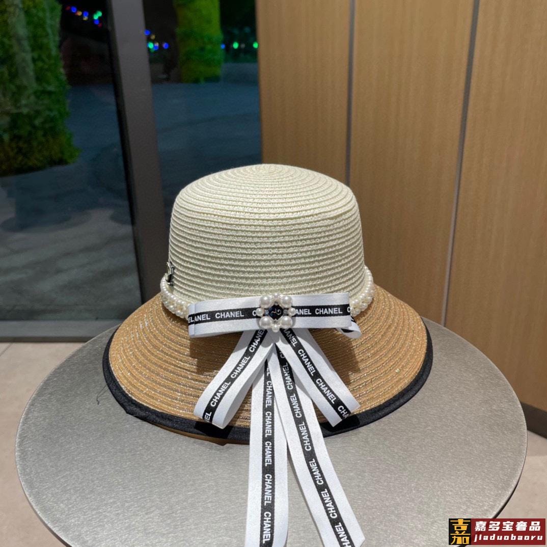 香奈儿早春新品蝴蝶结气质休闲草编草帽配珍珠夏日遮阳独家百搭风
