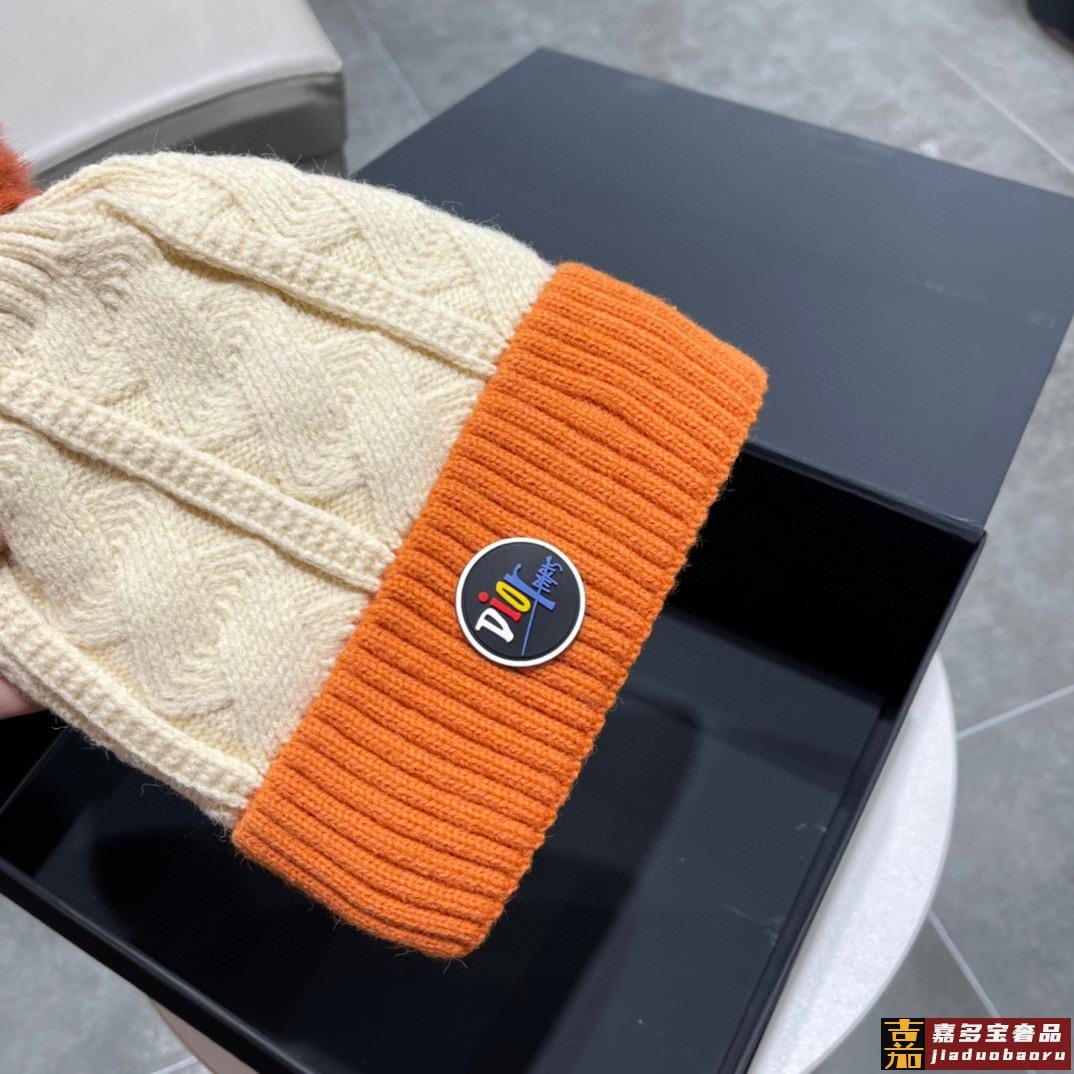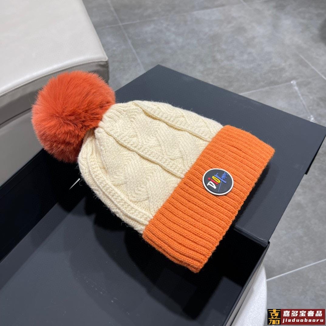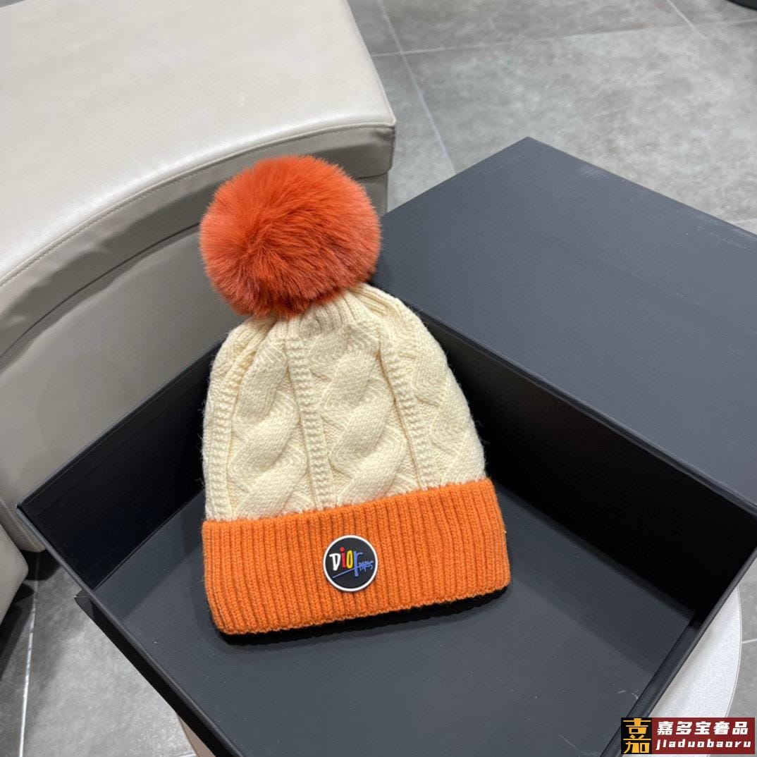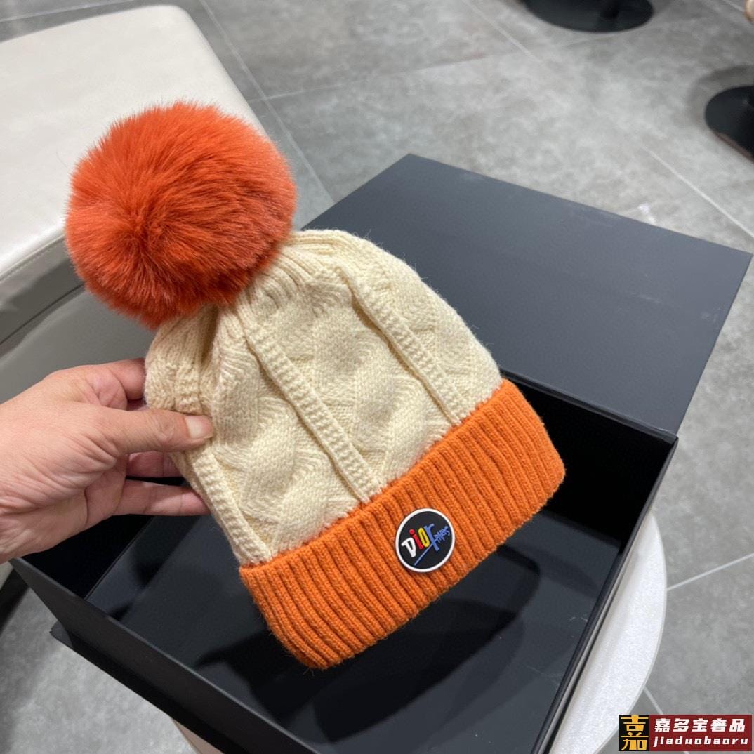 迪奥秋冬新款法国定毛毛球毛线帽秋冬保暖加绒加厚潮针织毛线帽高