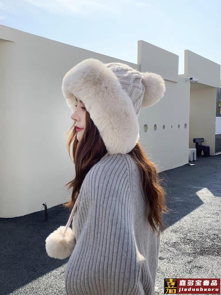 赛琳羊羔毛绒可爱耳朵帽子女冬季韩版百搭潮加厚保暖护耳毛线帽显