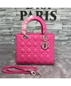 DIOR迪奥/五格羊皮/银扣/女士/玫红色/戴妃包/手提包/单肩包