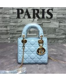 DIOR迪奥/三格羊皮/金扣/女士/冰蓝色/戴妃包/手提包/单肩包