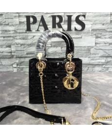 DIOR迪奥/头层羊皮/金扣/女士/三格漆皮/黑色/戴妃包/手提包/单肩包