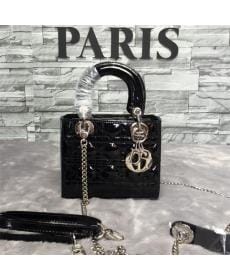 DIOR迪奥/头层羊皮/银扣/女士/三格漆皮/黑色/戴妃包/手提包/单肩包