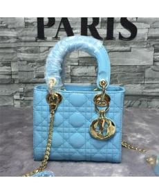 DIOR迪奥/头层羊皮/金扣/女士/三格漆皮/冰蓝色/戴妃包/手提包/单肩包