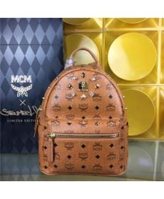 MCM时尚柳钉 PVC配皮 水钻小号 土黄色 女士双肩背包
