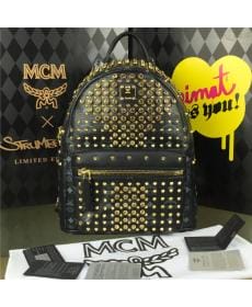 MCM时尚柳钉 PVC配皮 满钻小号 黑皮金钻 女士双肩背包