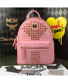 MCM时尚柳钉 PVC配皮 中号 粉色 女士双肩背包