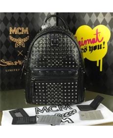 MCM时尚柳钉 PVC配皮 满钻小号 黑皮金钻 女士双肩背包