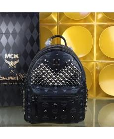 MCM时尚柳钉 PVC配皮 小号 黑色 女士双肩背包