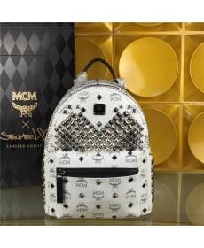 MCM时尚柳钉 PVC配皮 中号 白色 女士双肩背包