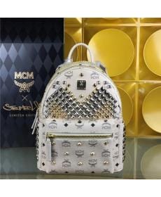 MCM时尚柳钉 PVC配皮 水钻小号 米白色 女士双肩背包