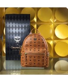 MCM时尚柳钉 PVC配皮 小号 土黄色 女士双肩背包