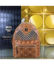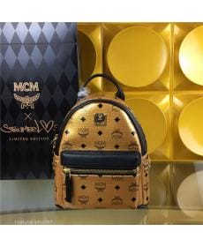 MCM时尚柳钉 PVC配皮 小号 土黄色 女士双肩背包