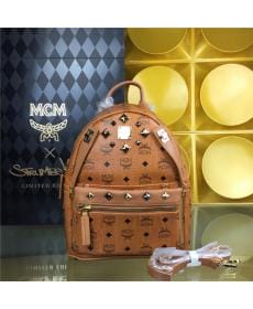 MCM时尚柳钉 PVC配皮 土黄色 女士双肩背包/母子包