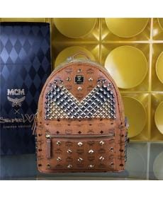 MCM时尚柳钉 PVC配皮 中号 土黄色 女士双肩背包