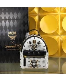 MCM时尚柳钉 小号 白色枪钉 PVC配皮 女士双肩背包
