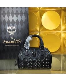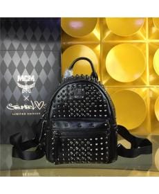 MCM时尚柳钉 PVC配皮 满钻小号 黑皮枪 女士双肩背包