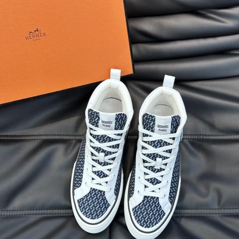 爱马仕* 新品男士高帮休闲运动鞋,斜体H图案牛仔布和小牛皮拼