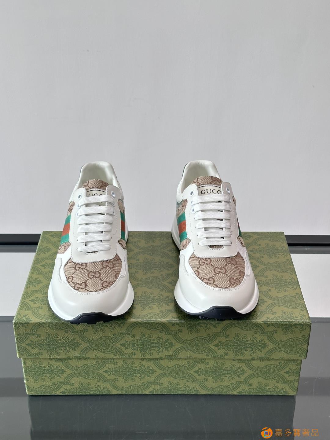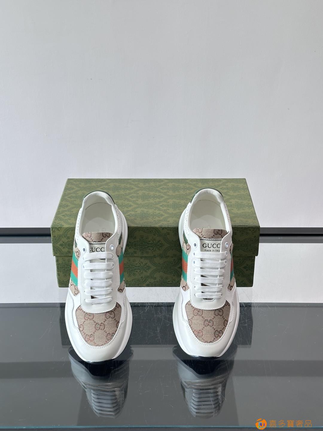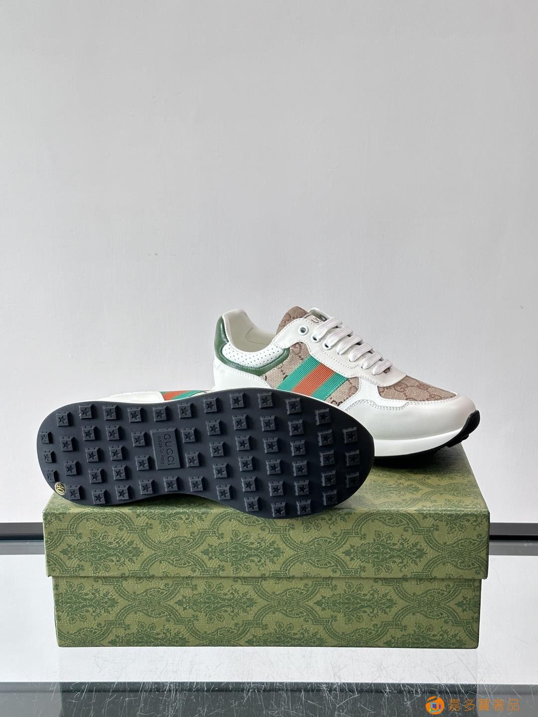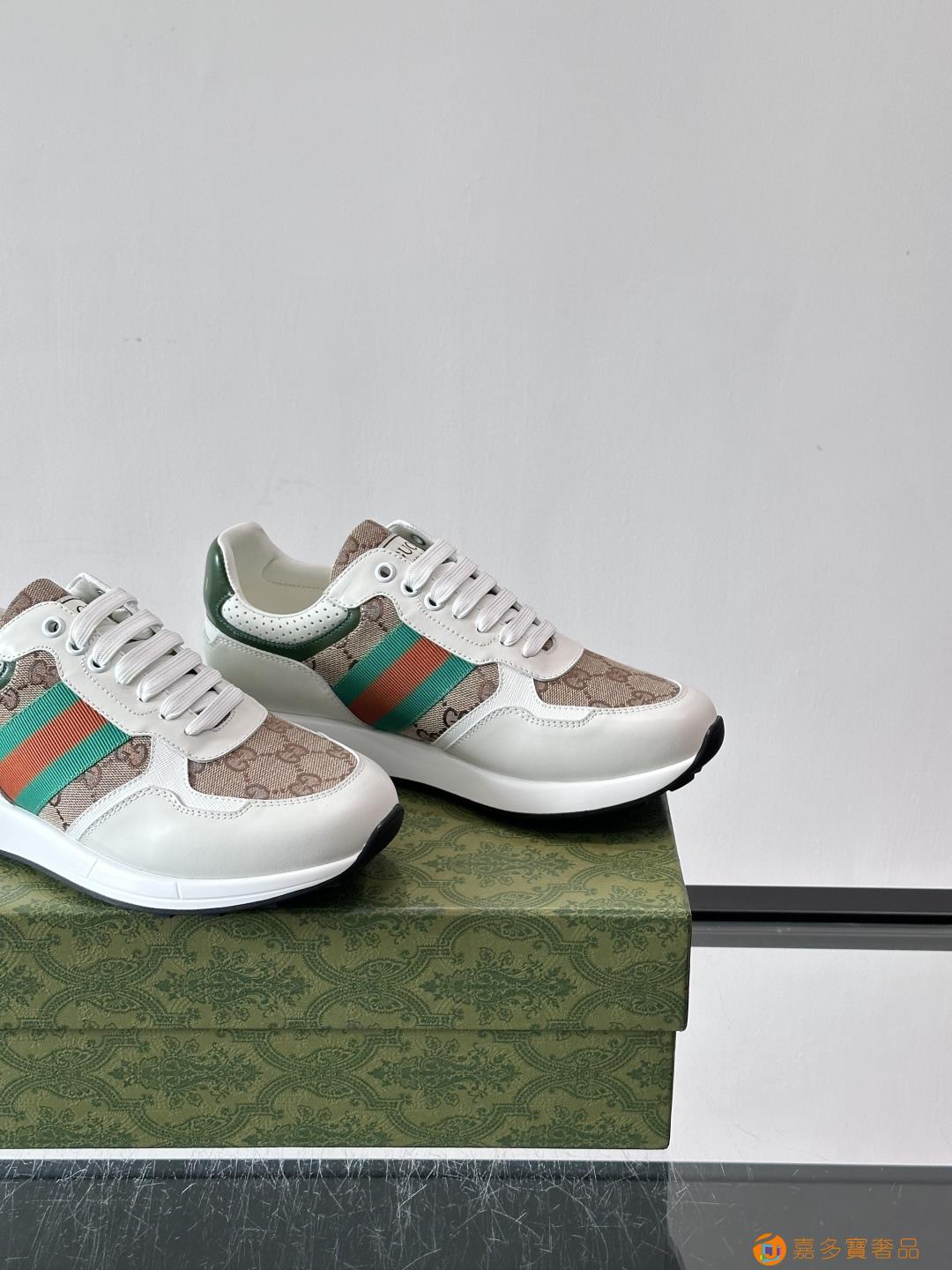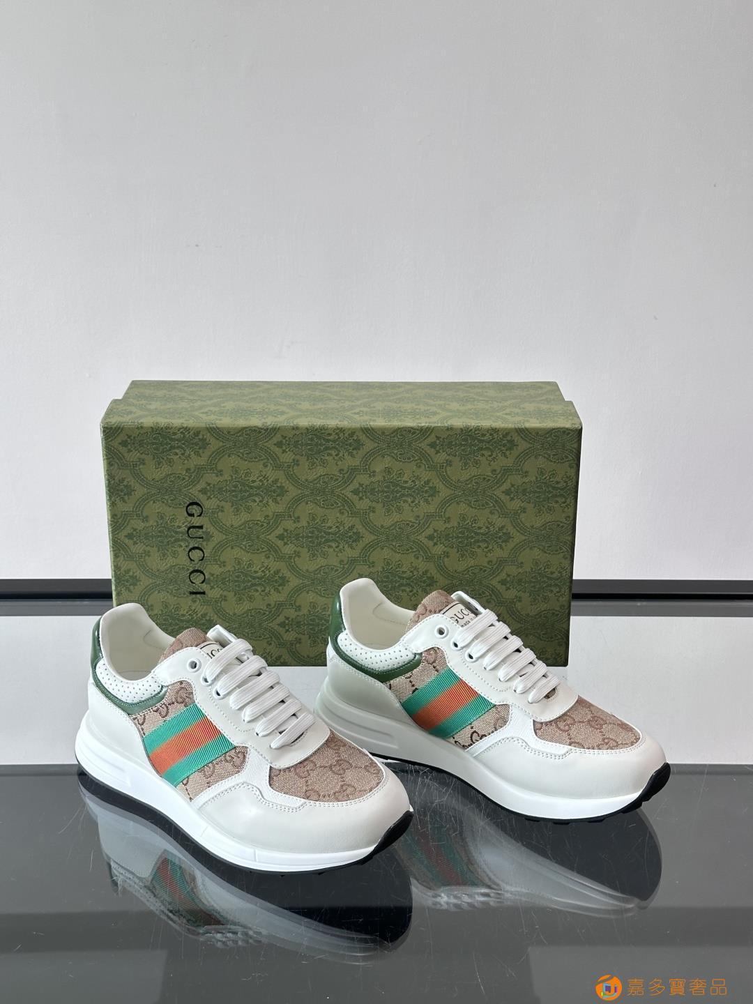 古奇经典的老爹鞋,采用冲孔与皮革拼接设计,鞋身侧面有品牌标志