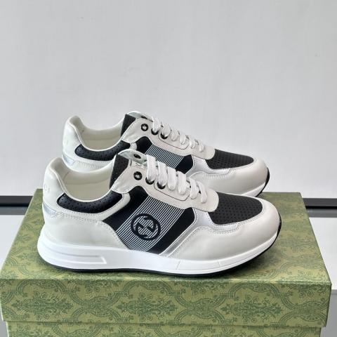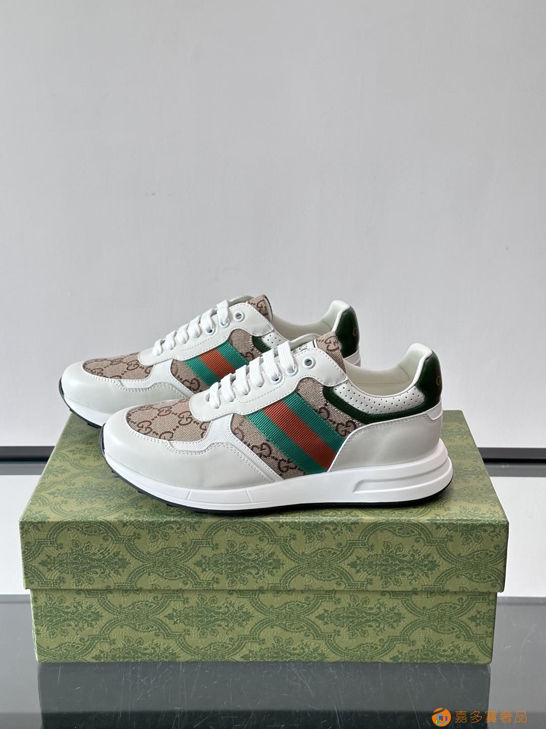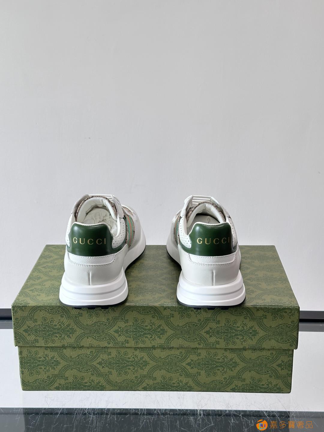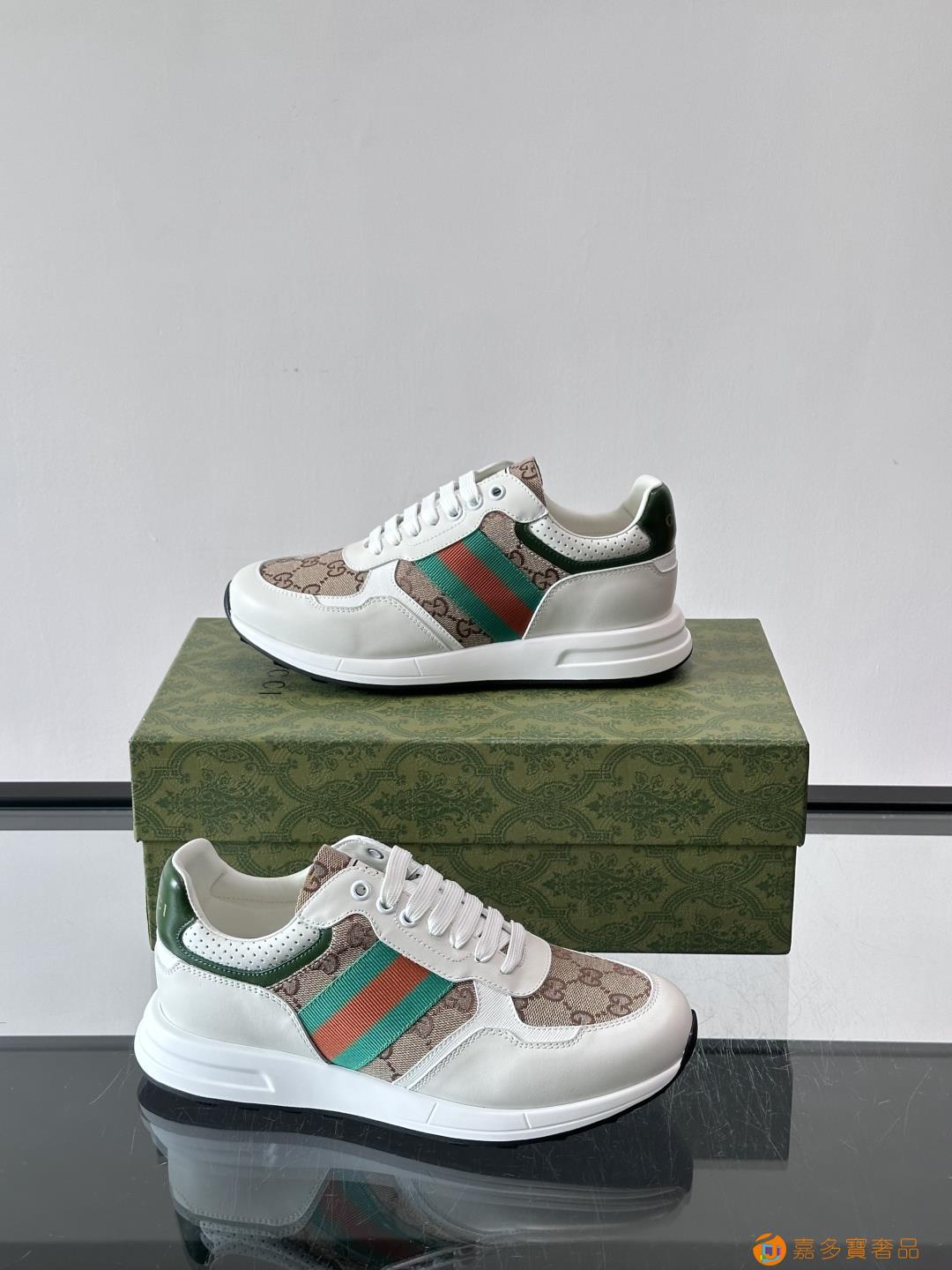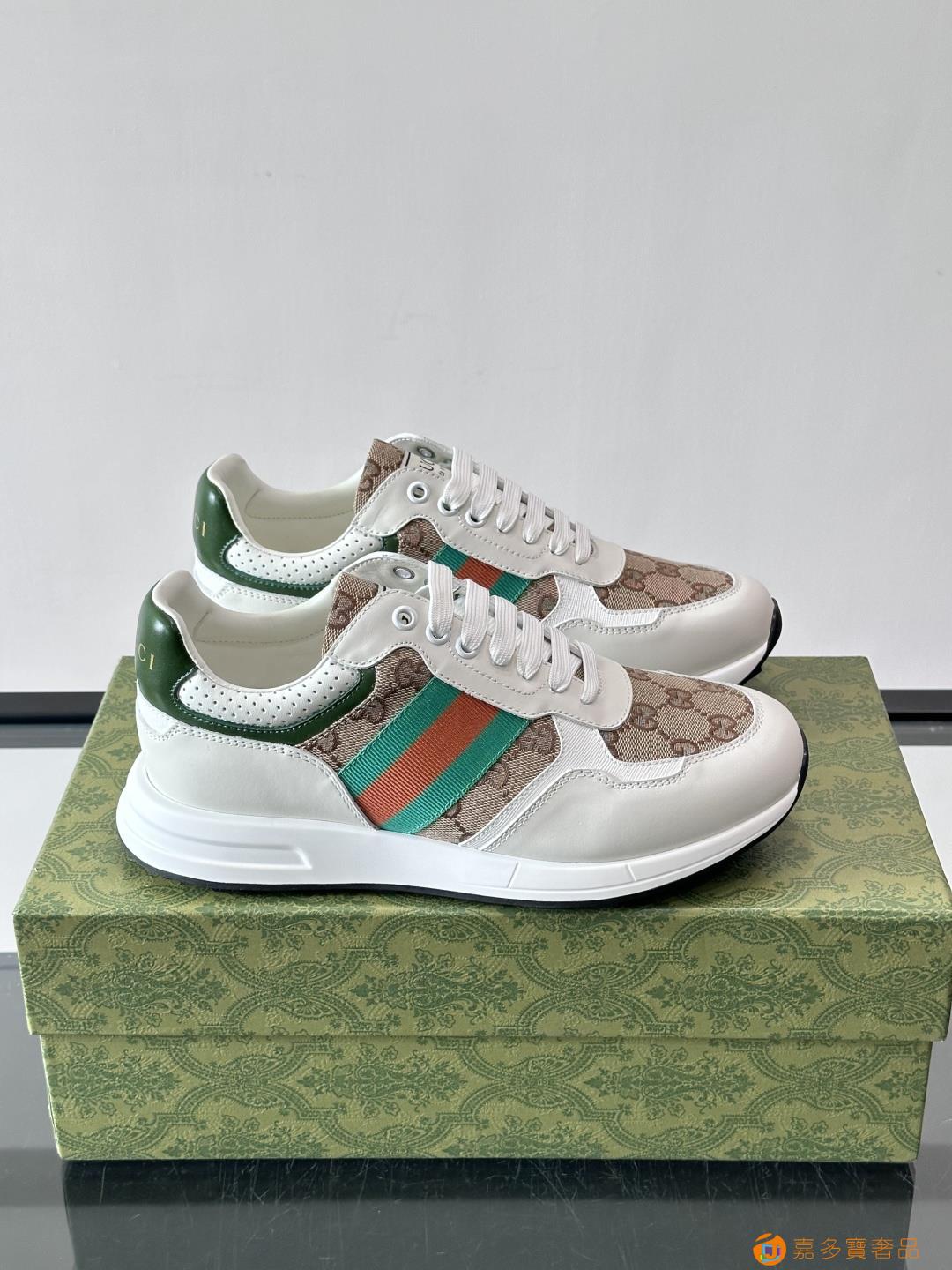 古奇经典的老爹鞋,采用冲孔与皮革拼接设计,鞋身侧面有品牌标志