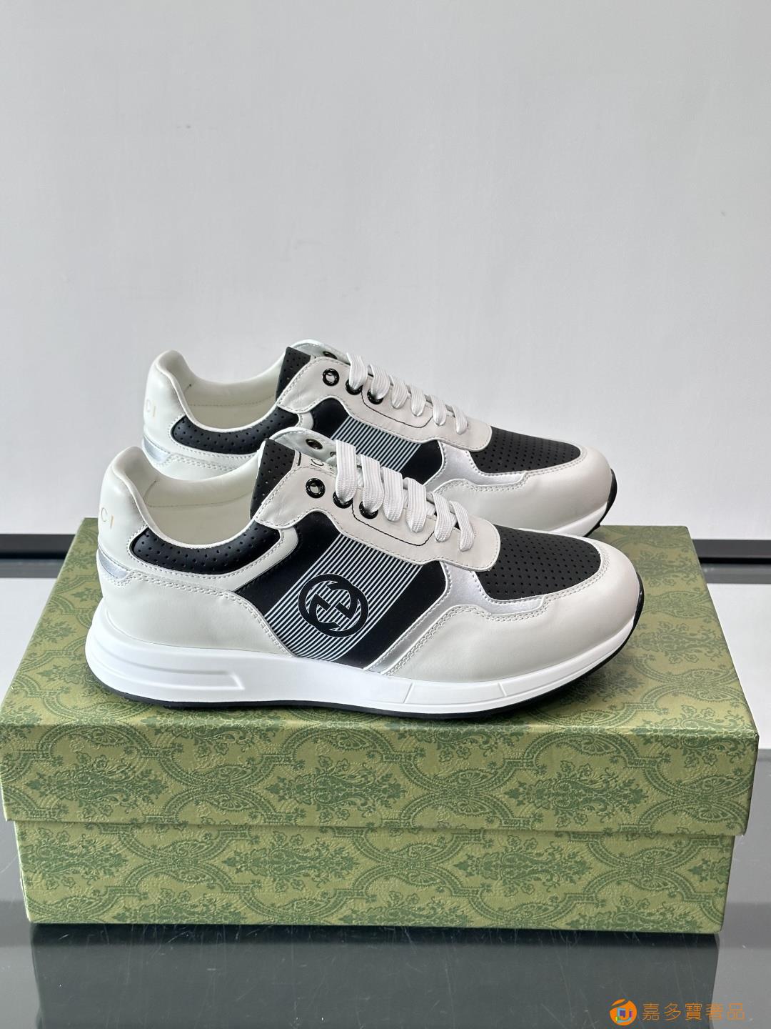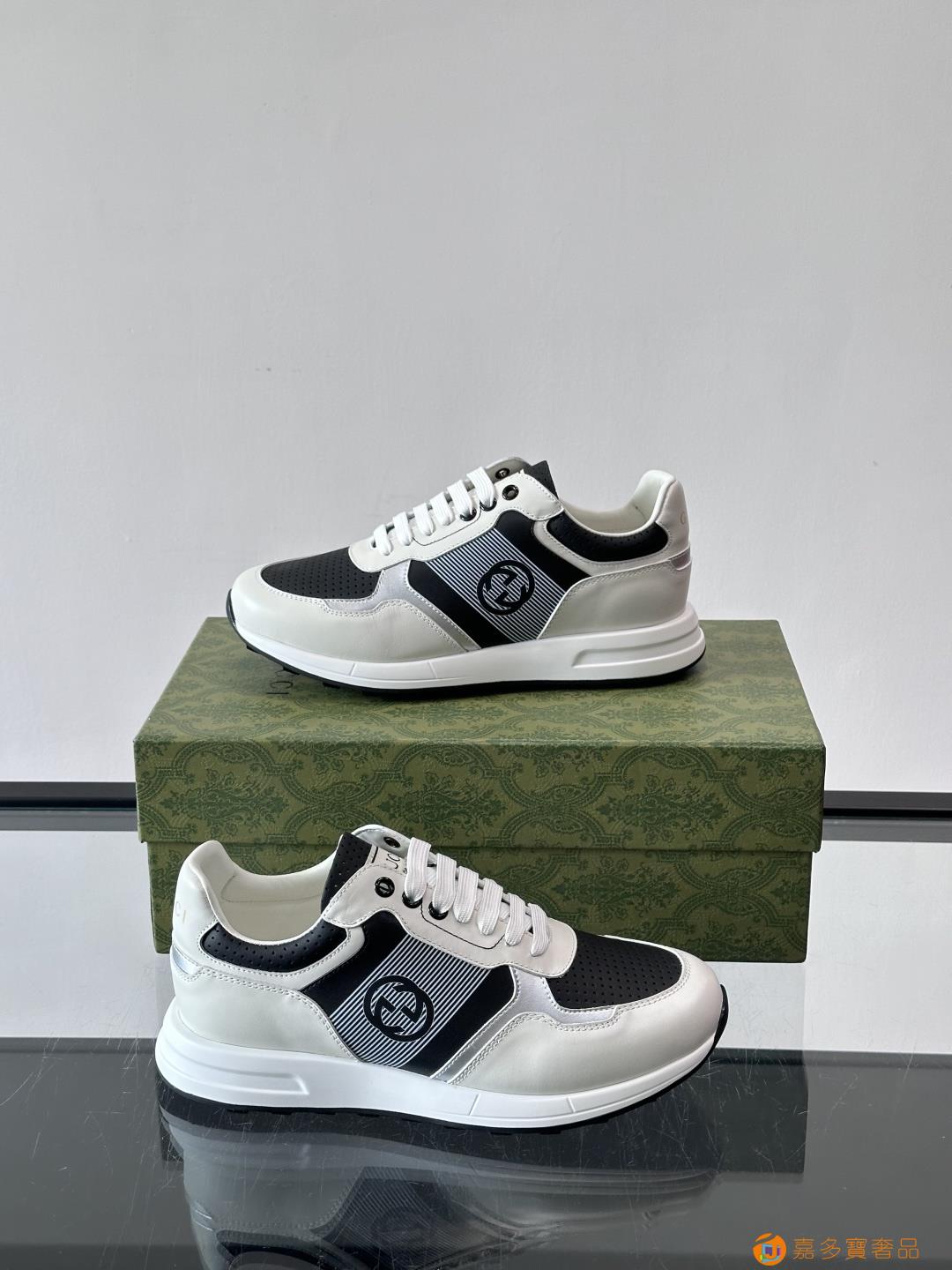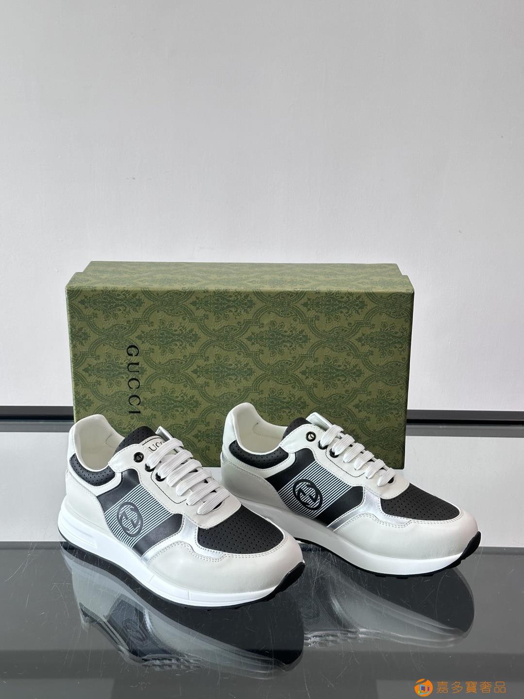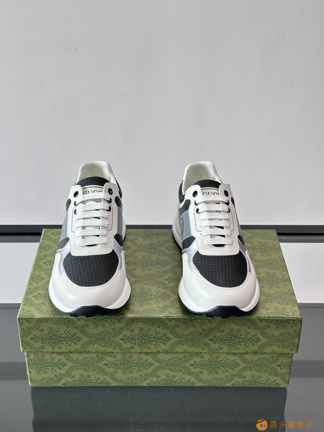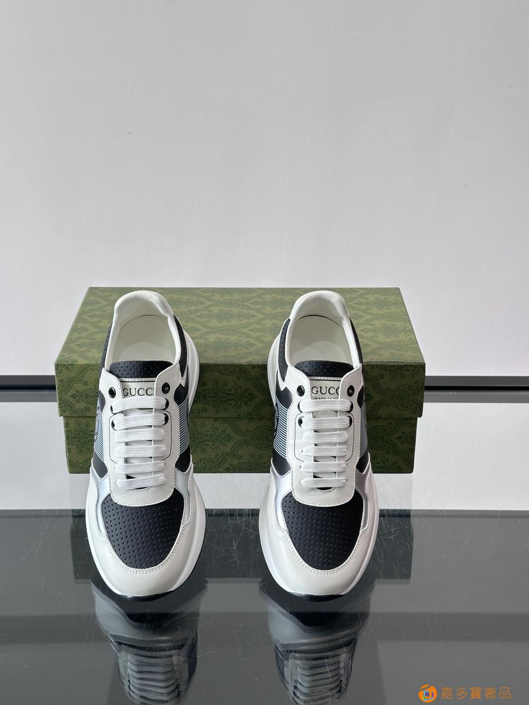 古奇经典的老爹鞋,采用冲孔与皮革拼接设计,鞋身侧面有品牌标志