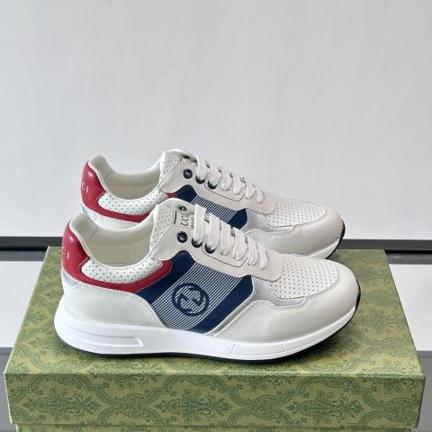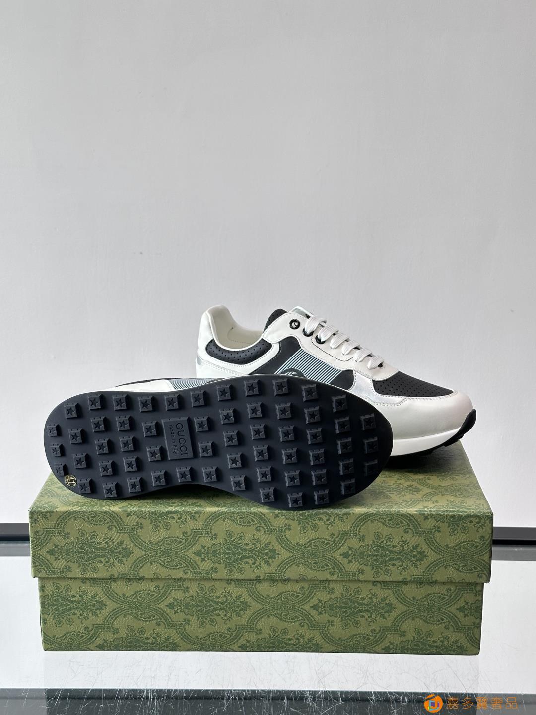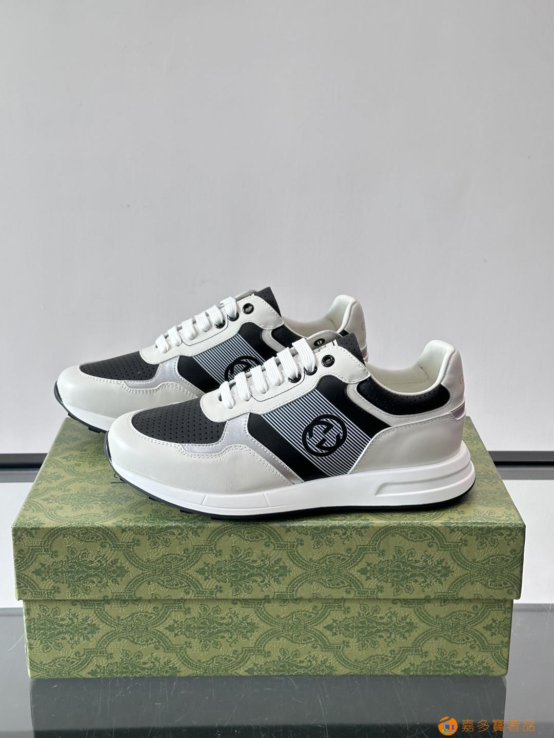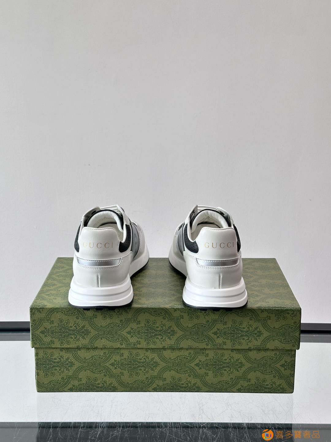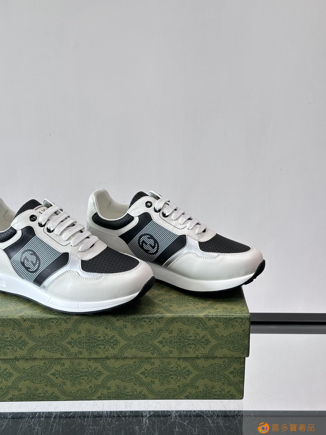 古奇经典的老爹鞋,采用冲孔与皮革拼接设计,鞋身侧面有品牌标志