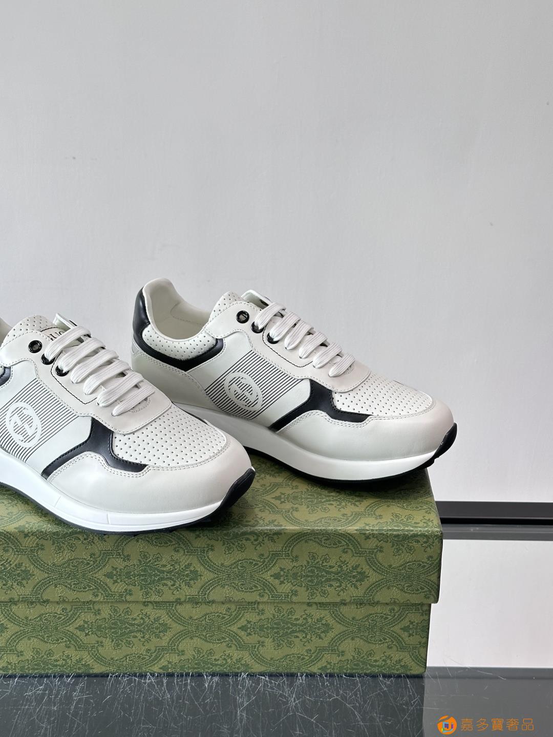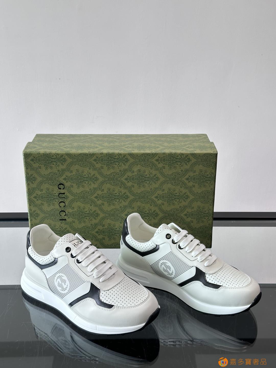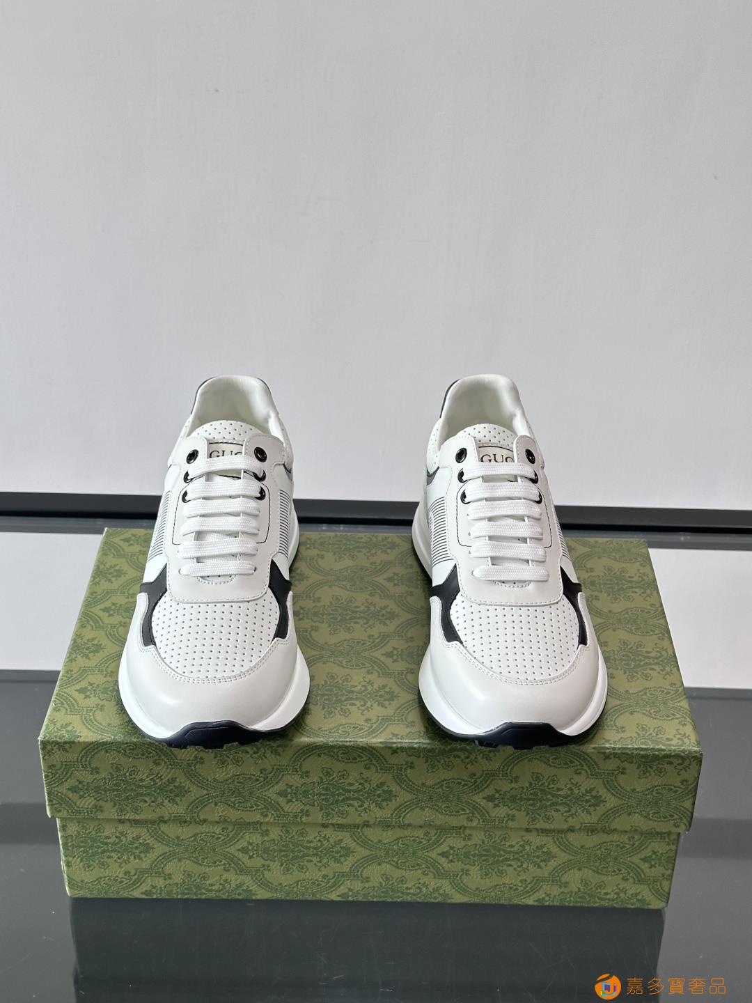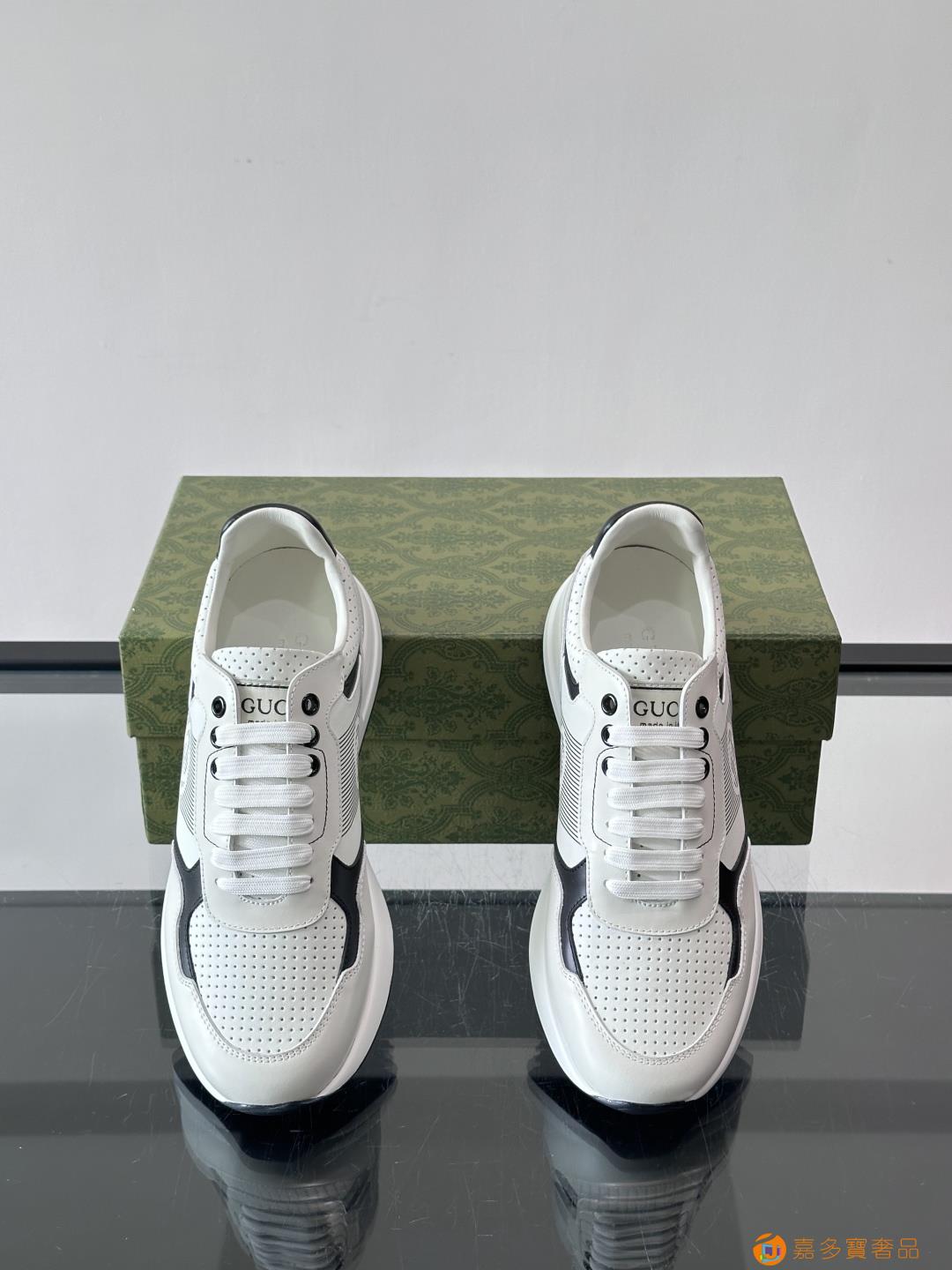 古奇经典的老爹鞋,采用冲孔与皮革拼接设计,鞋身侧面有品牌标志