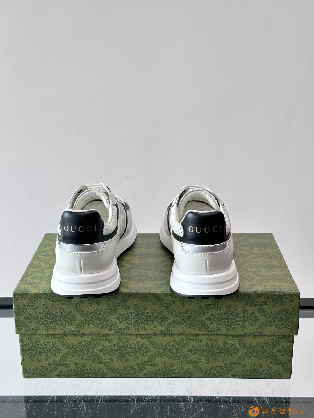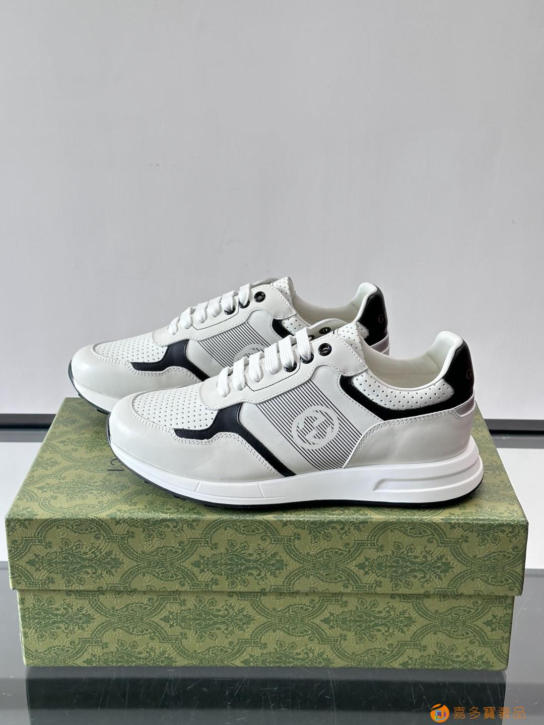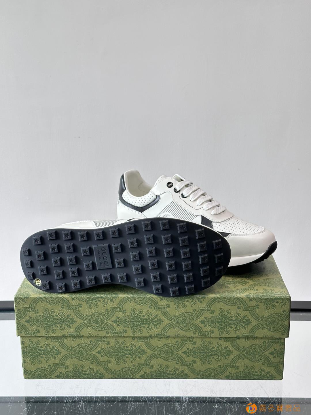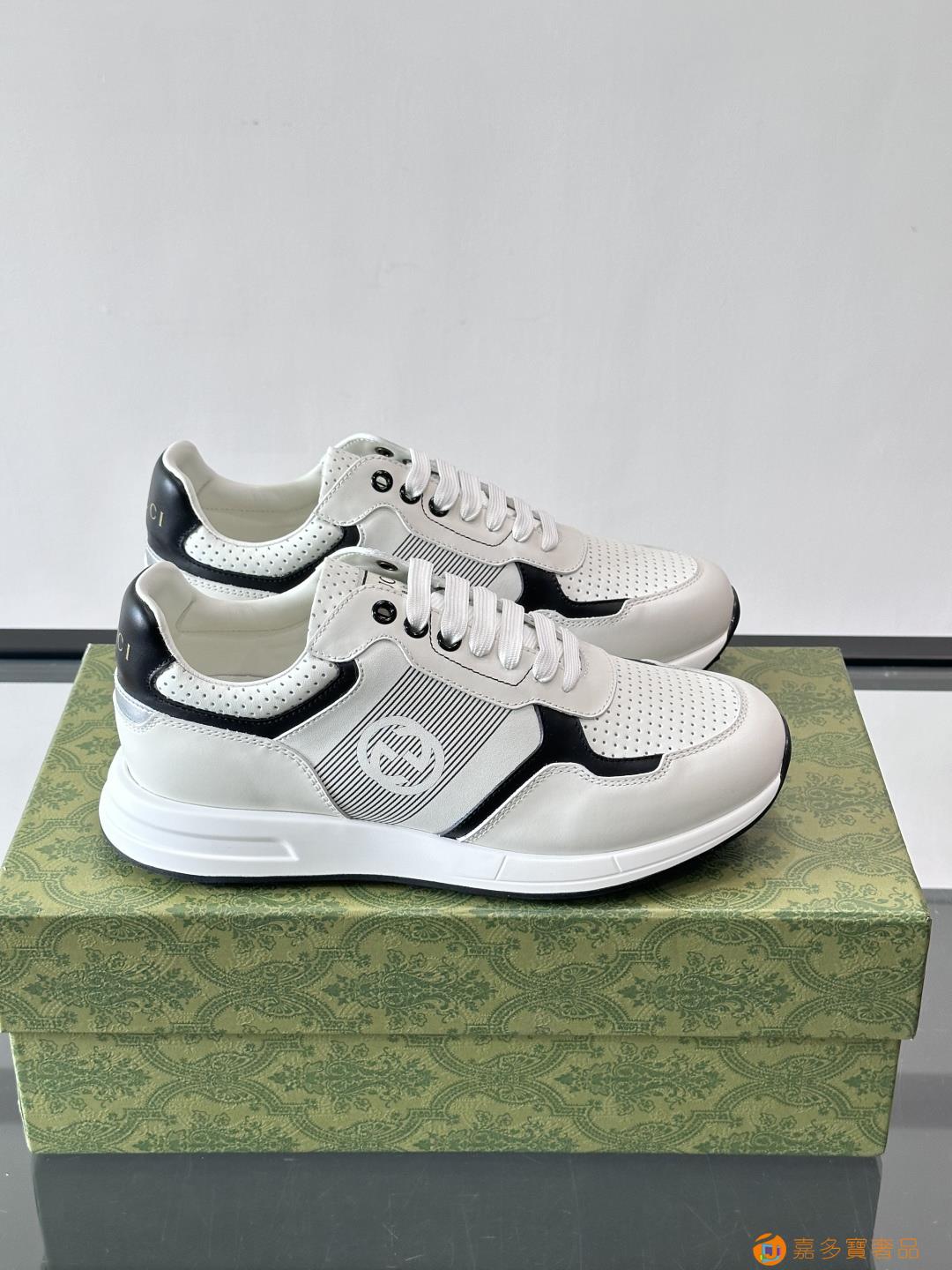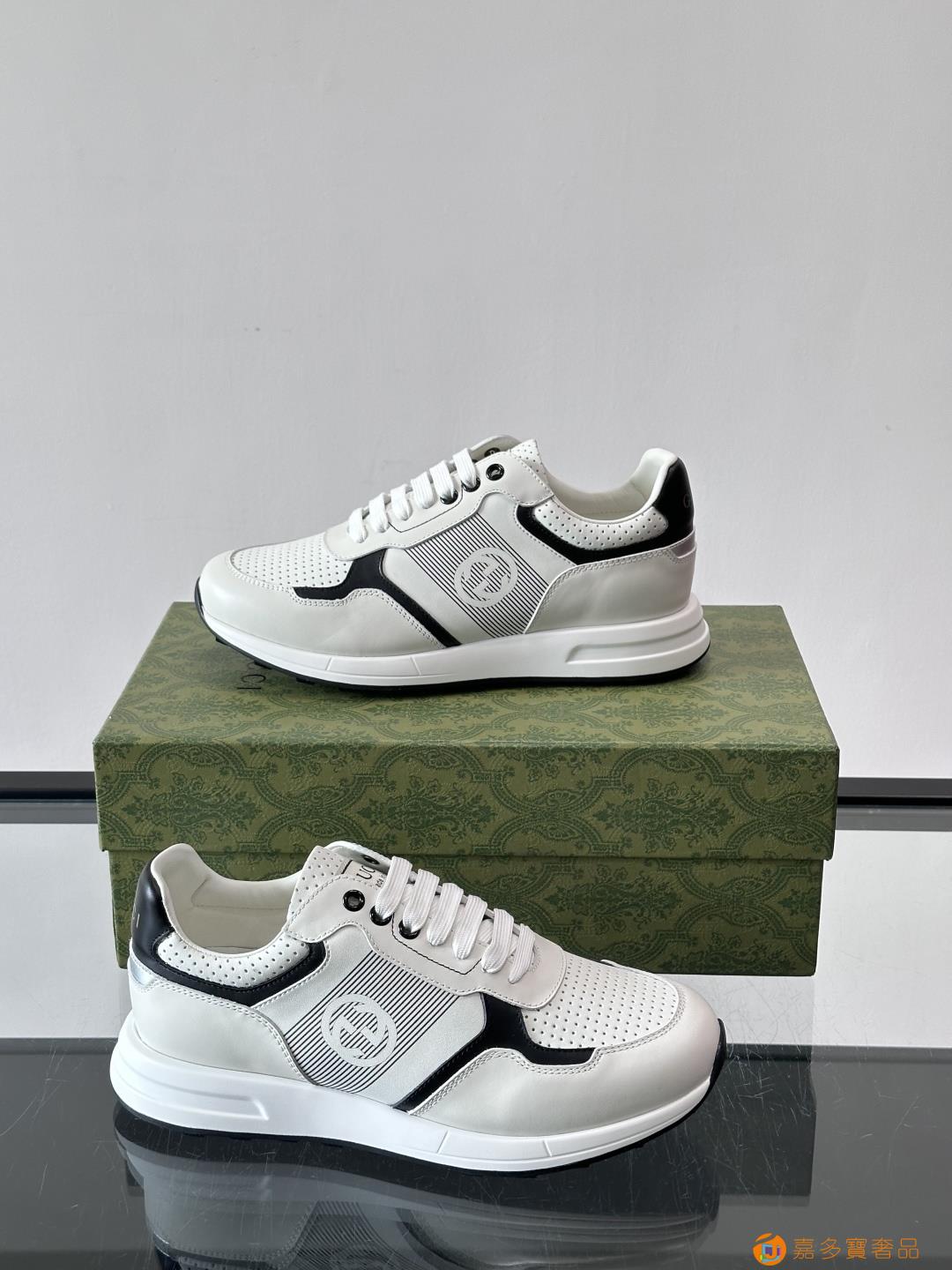 古奇经典的老爹鞋,采用冲孔与皮革拼接设计,鞋身侧面有品牌标志