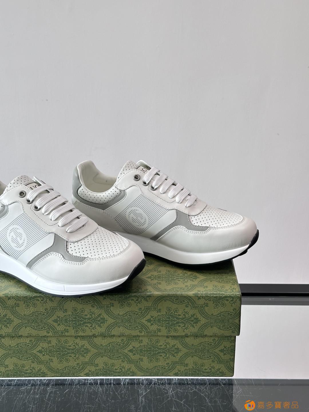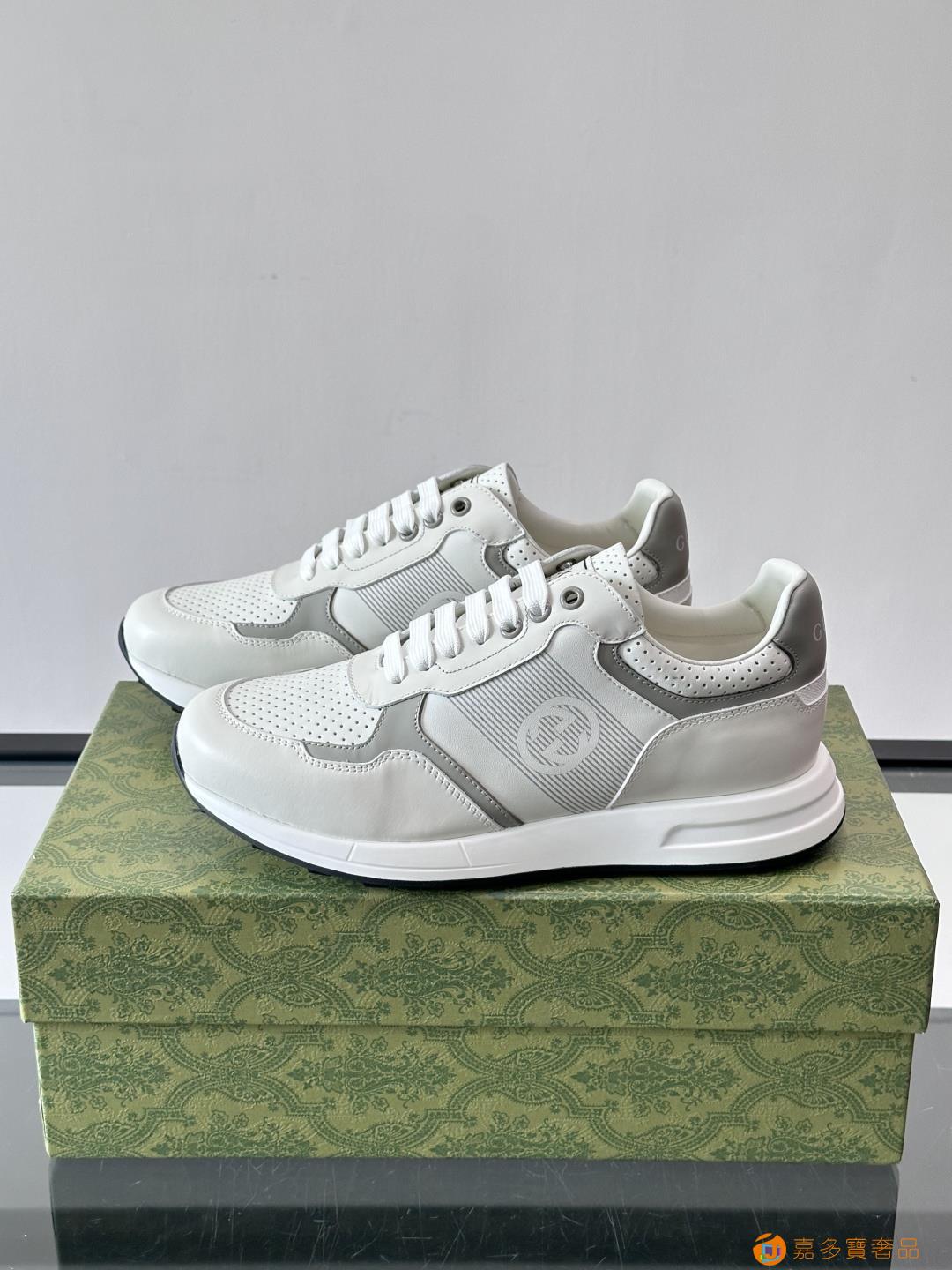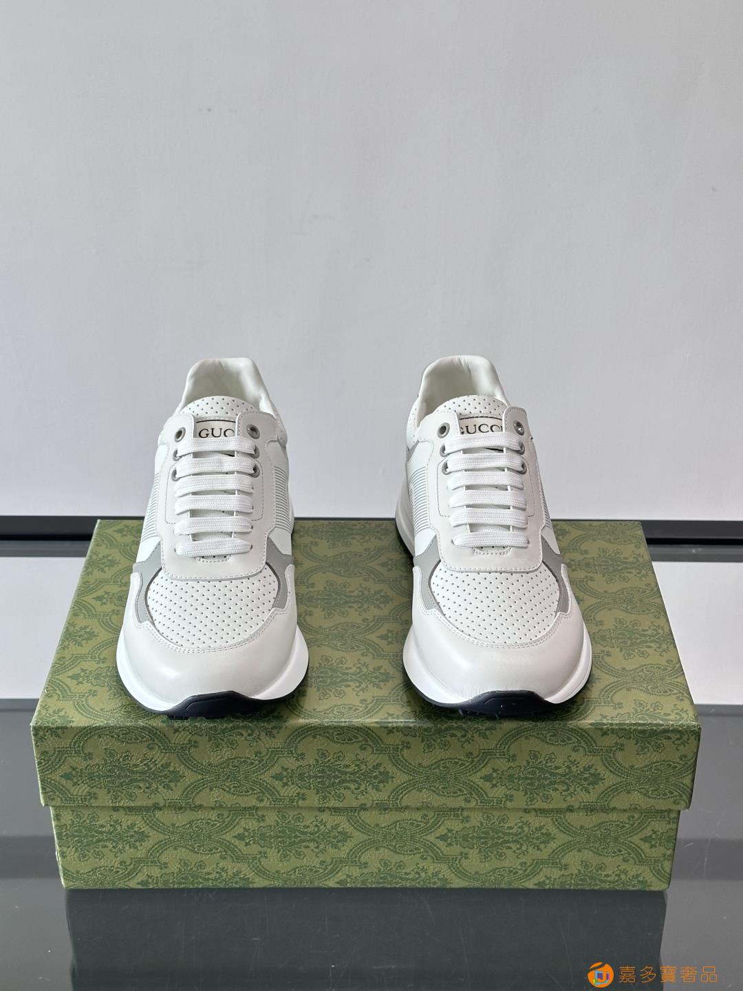 古奇经典的老爹鞋,采用冲孔与皮革拼接设计,鞋身侧面有品牌标志