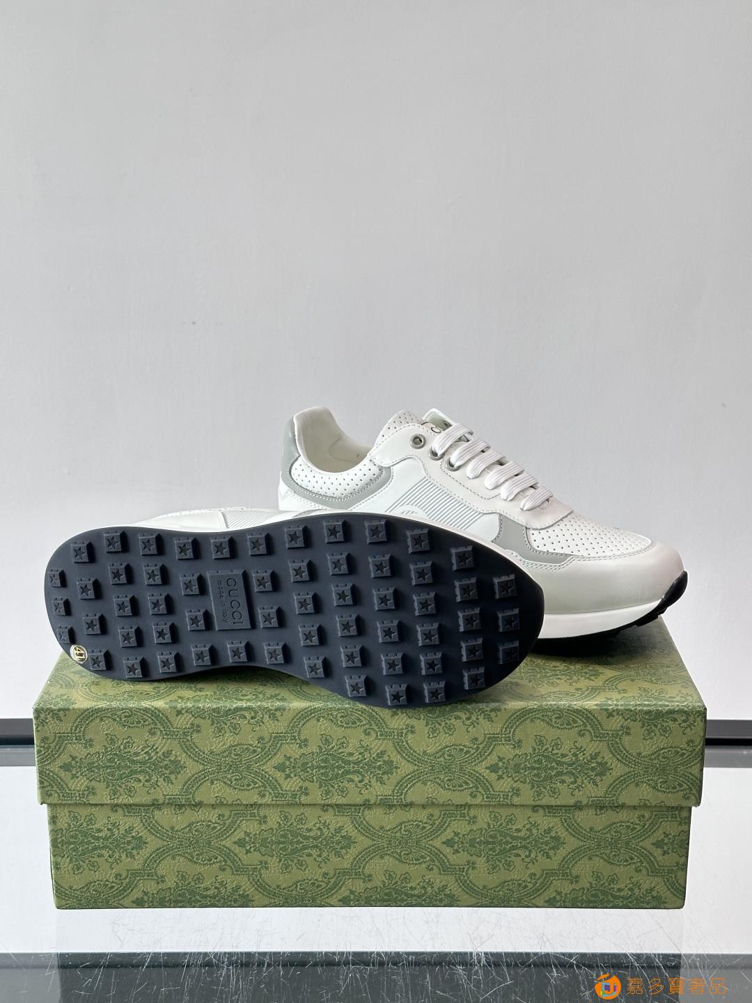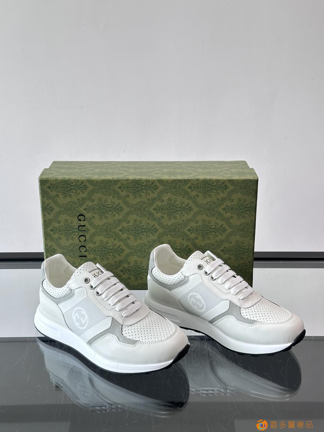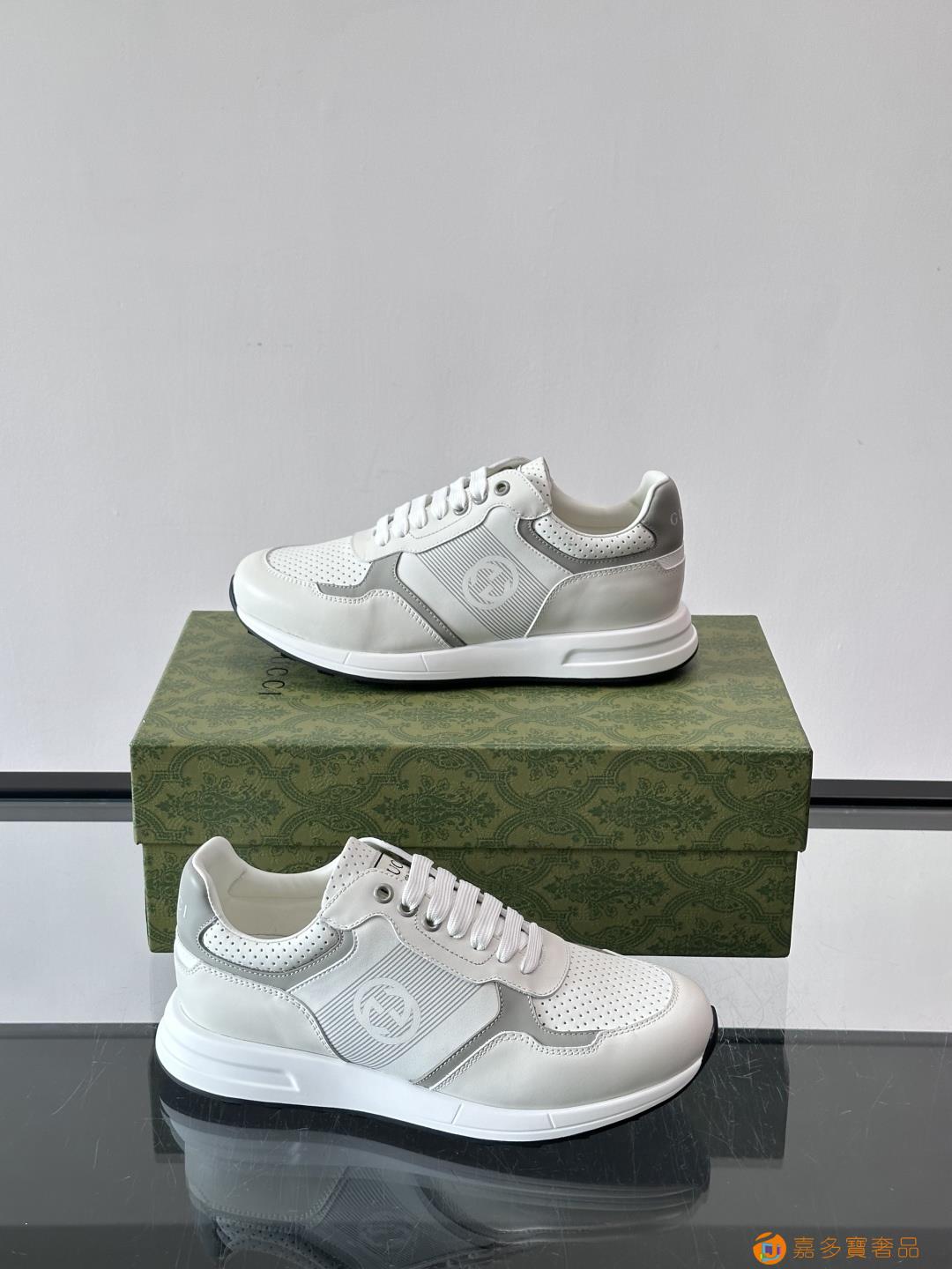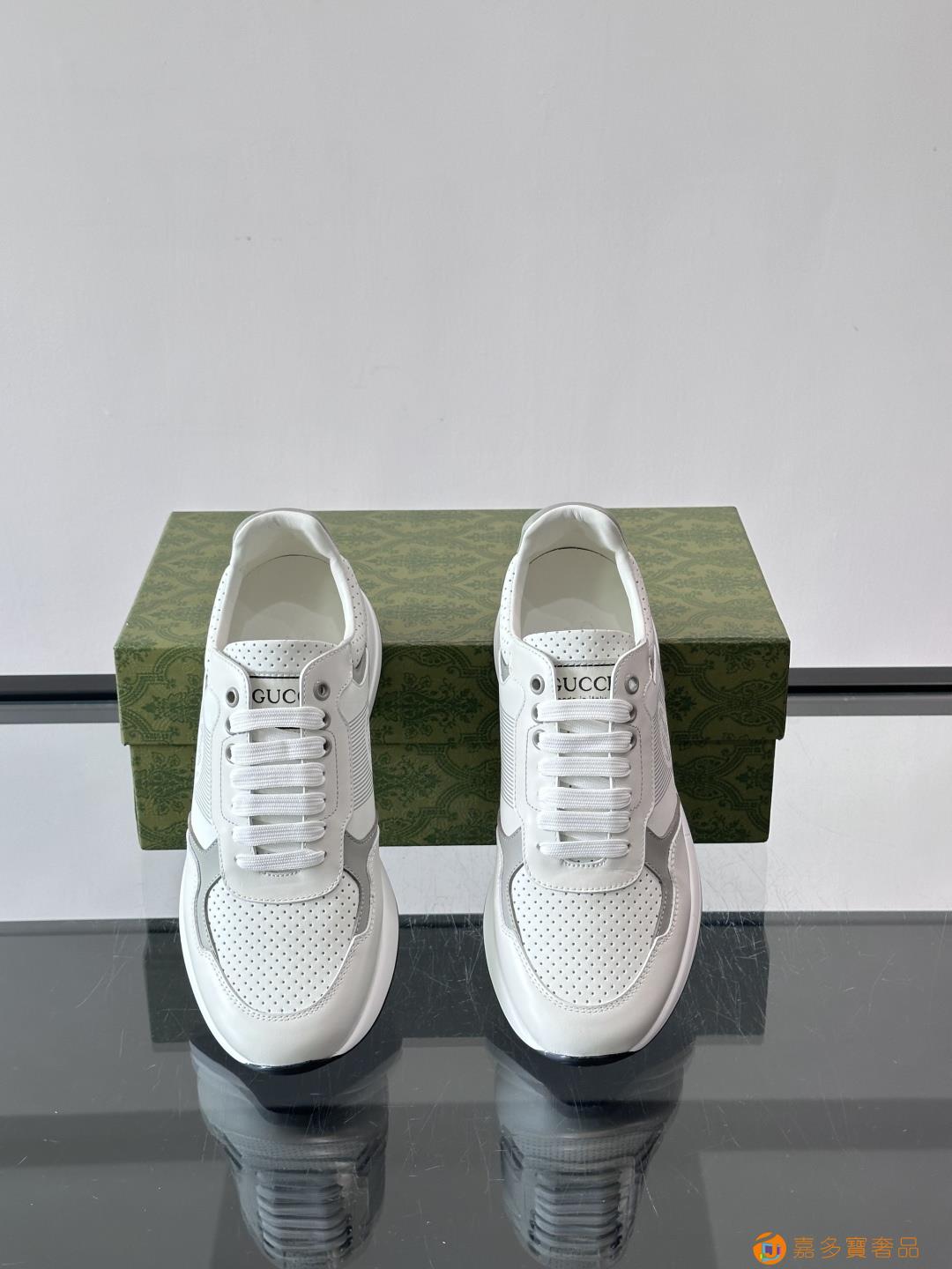 古奇经典的老爹鞋,采用冲孔与皮革拼接设计,鞋身侧面有品牌标志