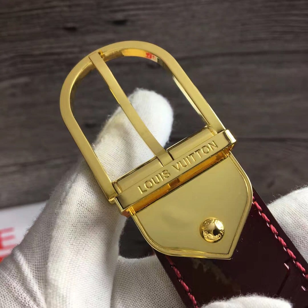 Lv女款3.0宽专柜最新版 带身:漆皮配头层磨砂底 颜色:枣红色 扣头:针式扣 说明:这款时尚的腰带色彩富丽亮泽,与路易威登 Monogram Vernis 皮革系列产品相得益彰,搭配任何装束,均倍添动感妩媚的气息。