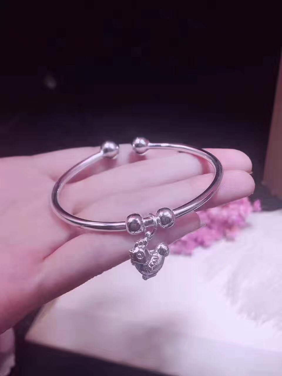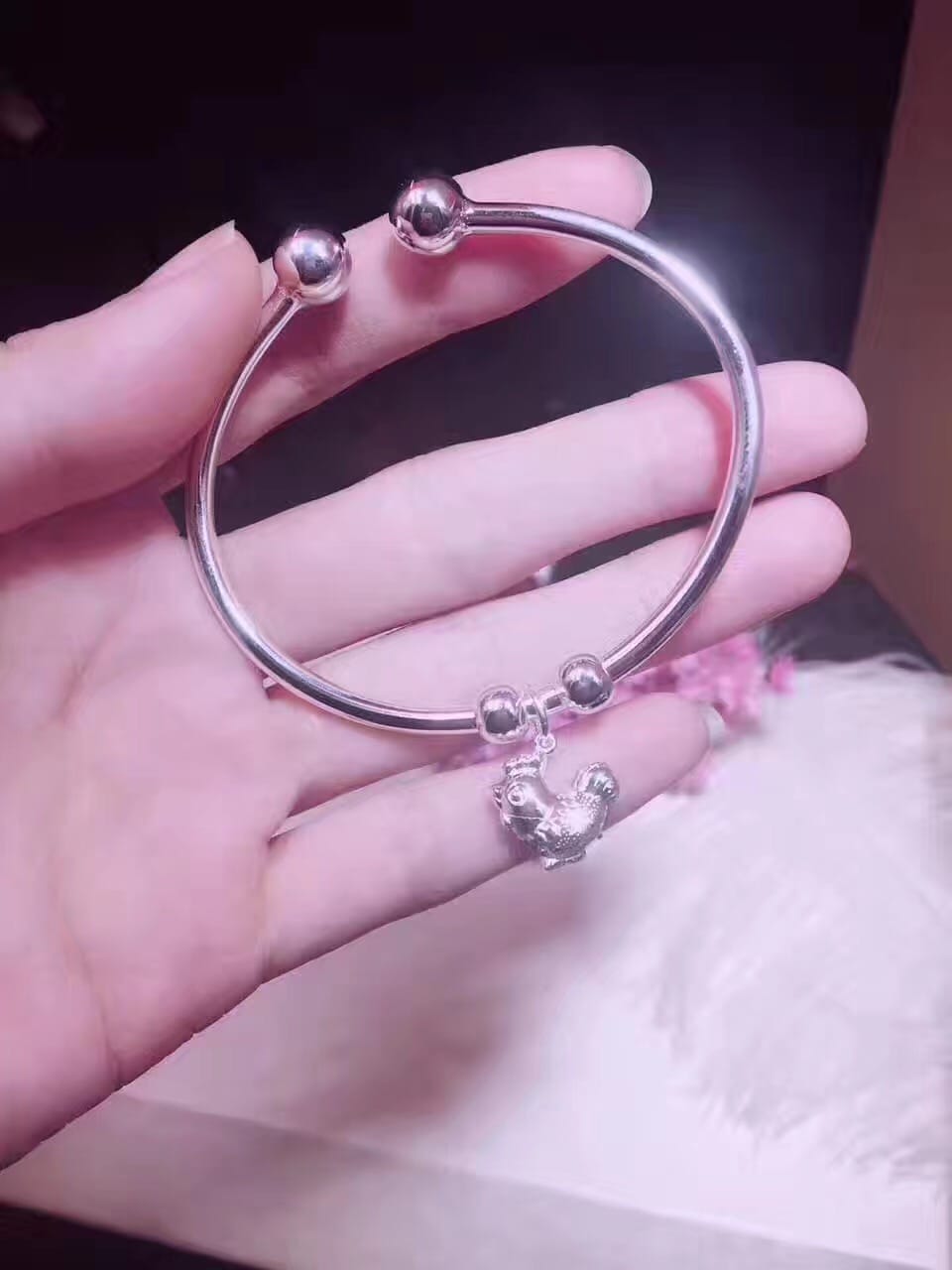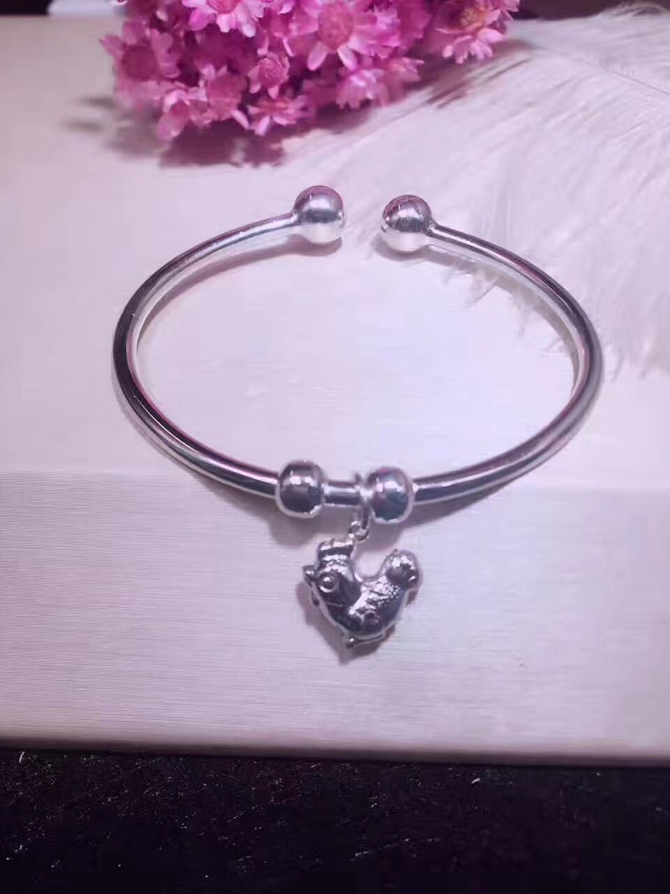 S990千足银小鸡仔开口手镯 金鸡贺岁 对珠开口大小可调节