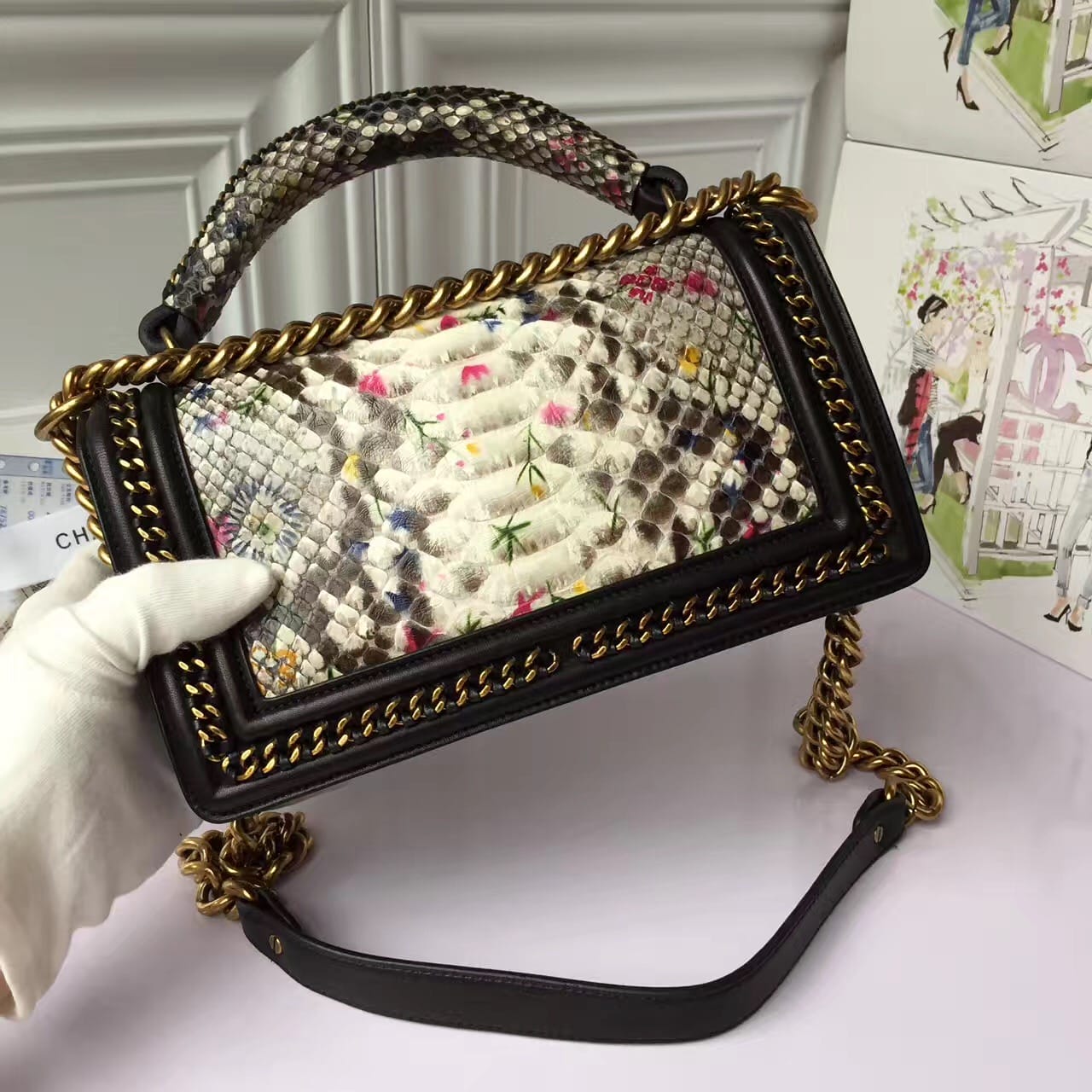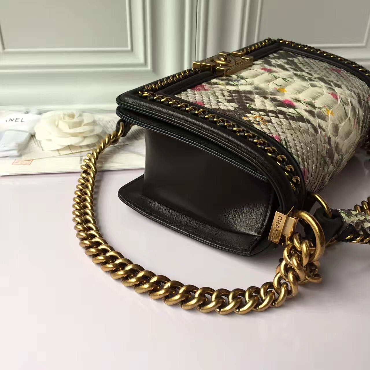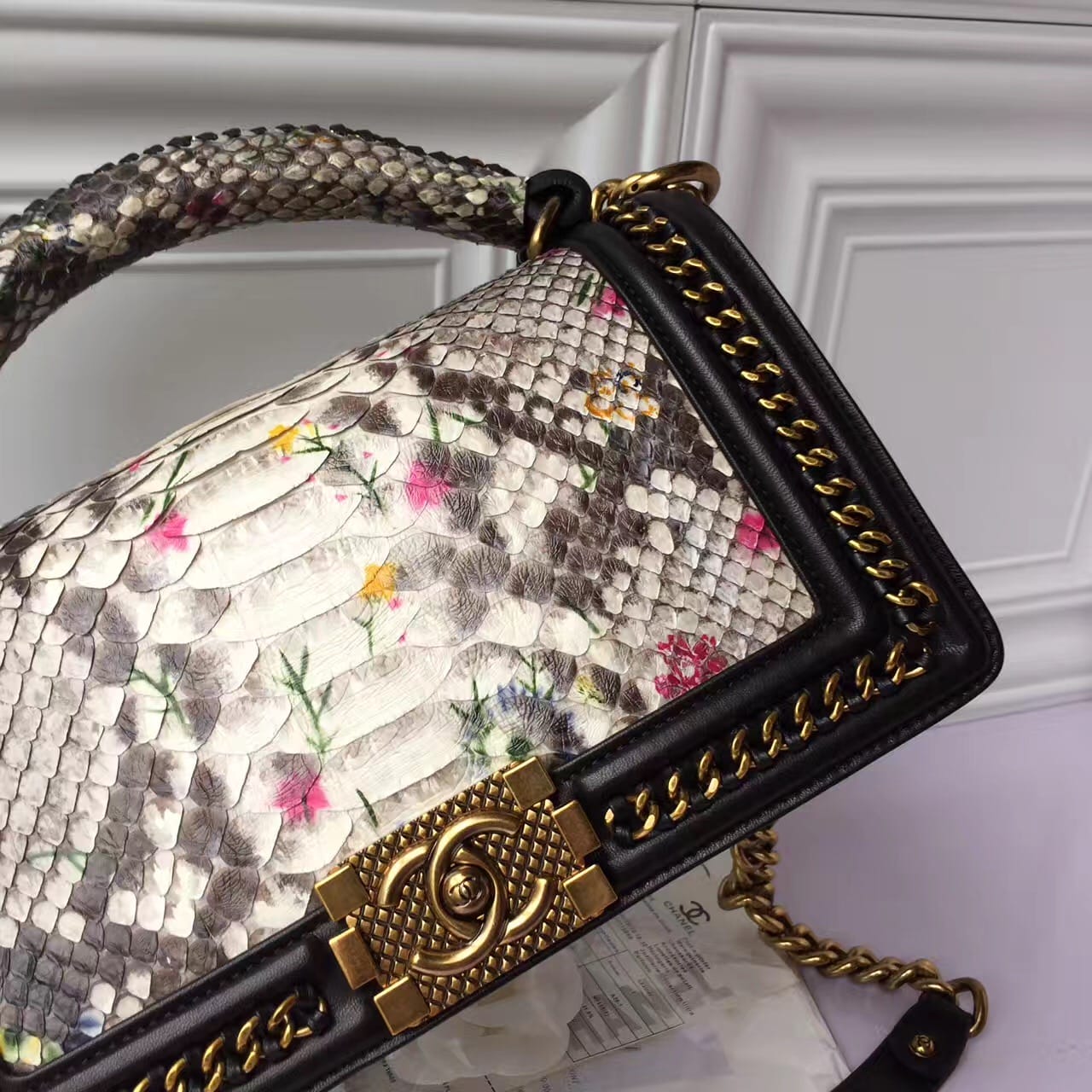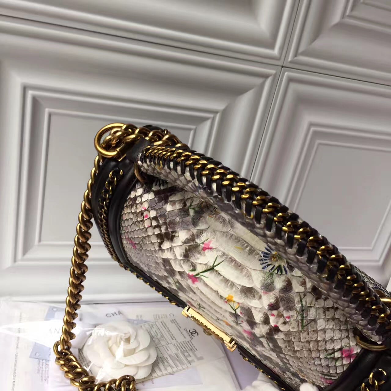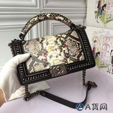 香奈儿 非洲进口野生蟒蛇皮配羊皮内花卉金色金属女士斜挎包