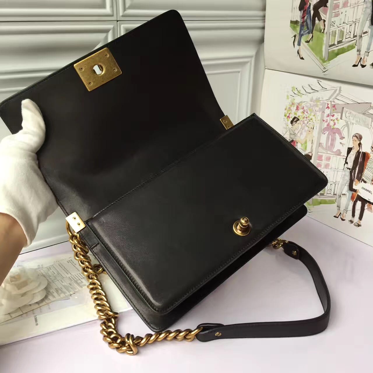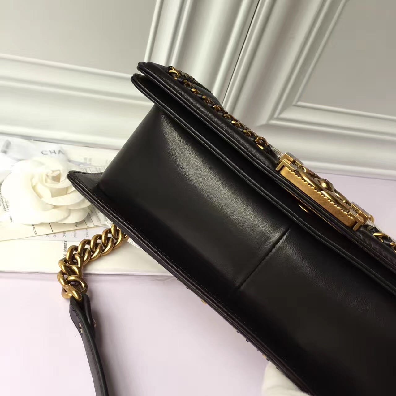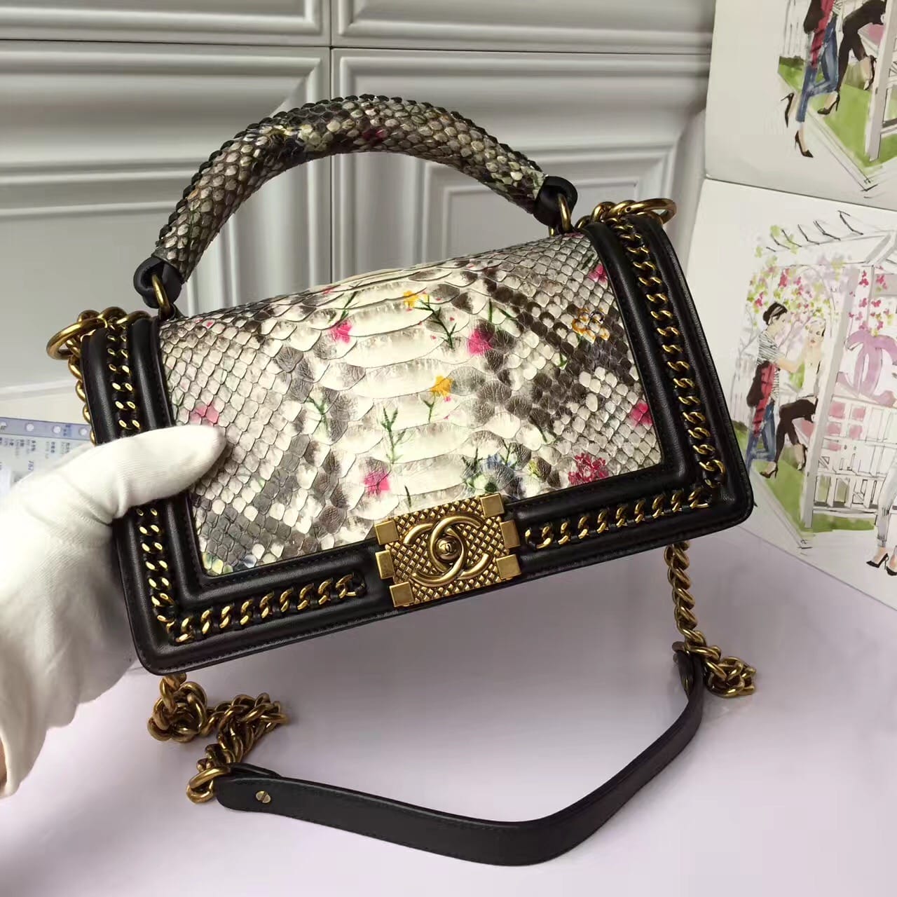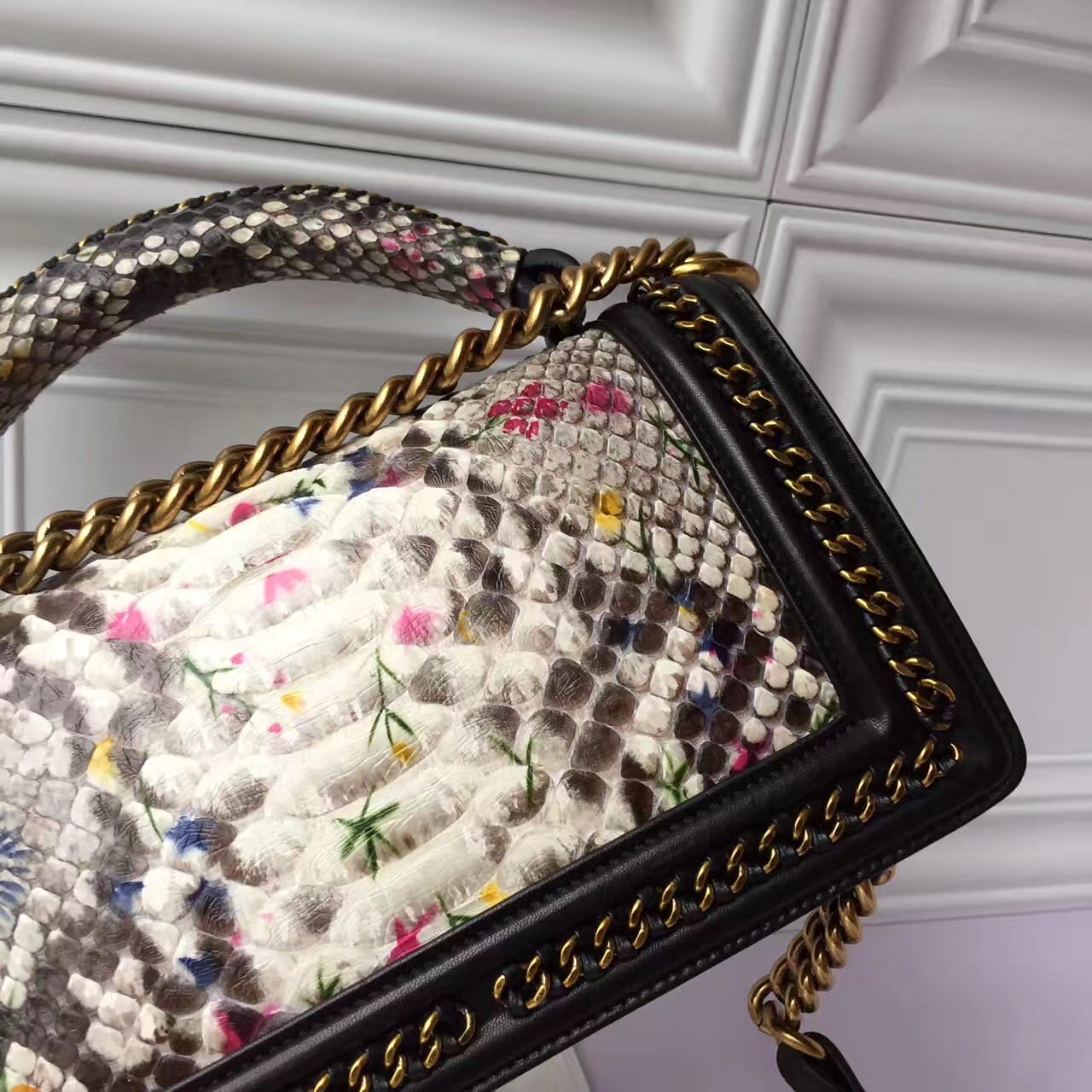 香奈儿 非洲进口野生蟒蛇皮配羊皮内花卉金色金属女士斜挎包