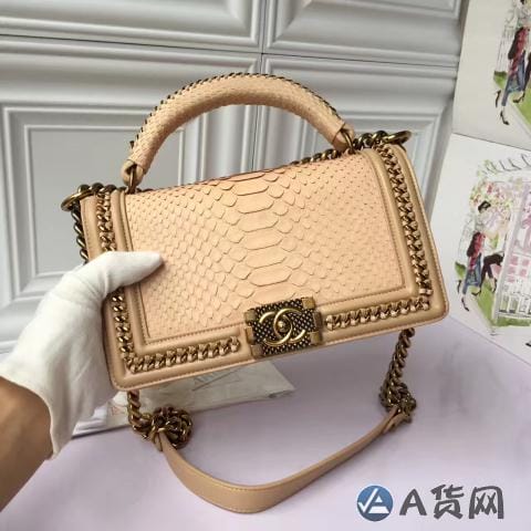 香奈儿 野生蟒蛇皮配羊皮肉色 金色金属女士斜挎包