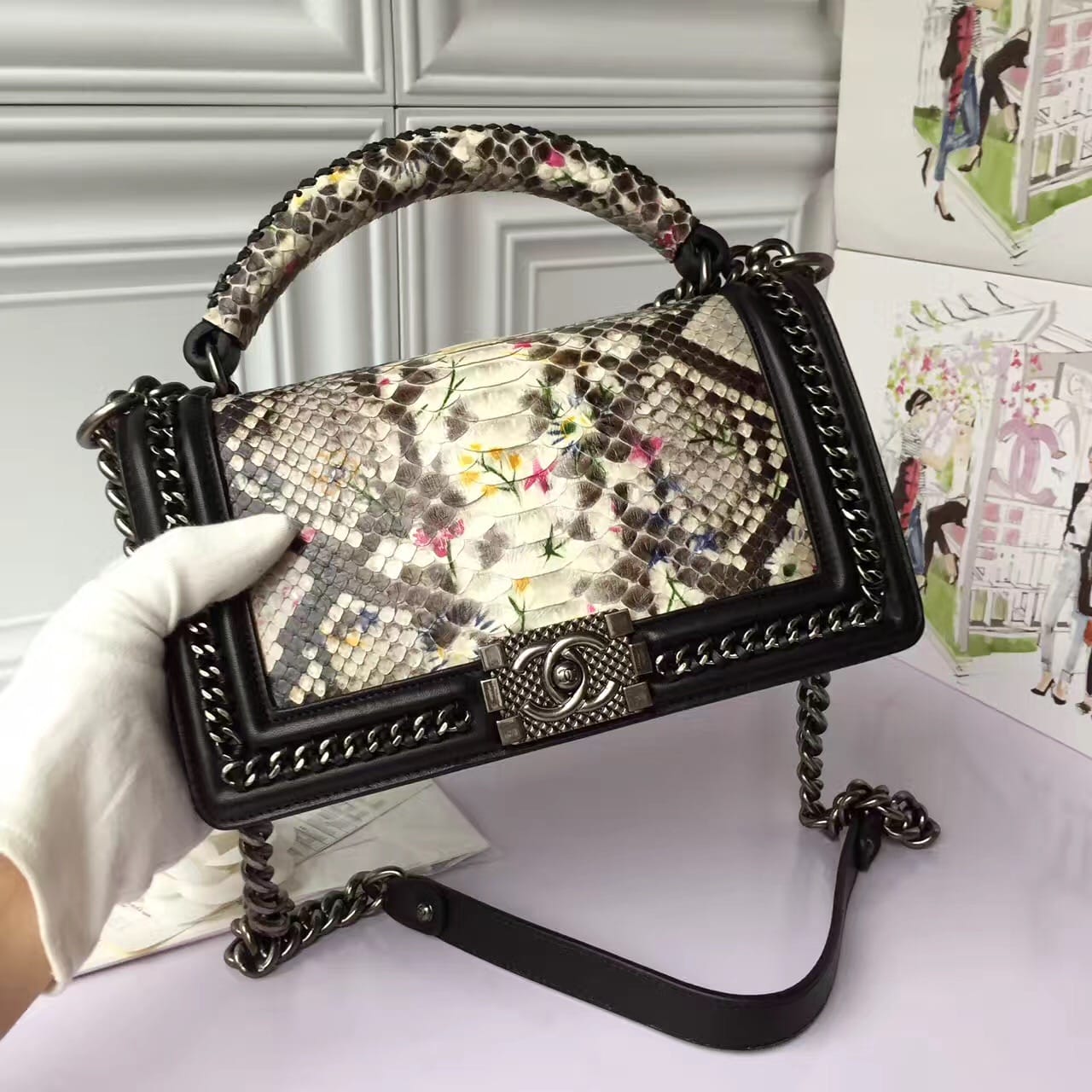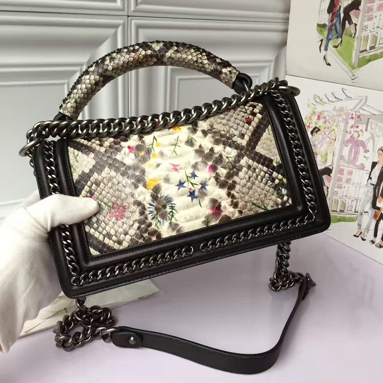 香奈儿 银色金属 精美编织搭配蟒蛇皮花卉女士斜挎包