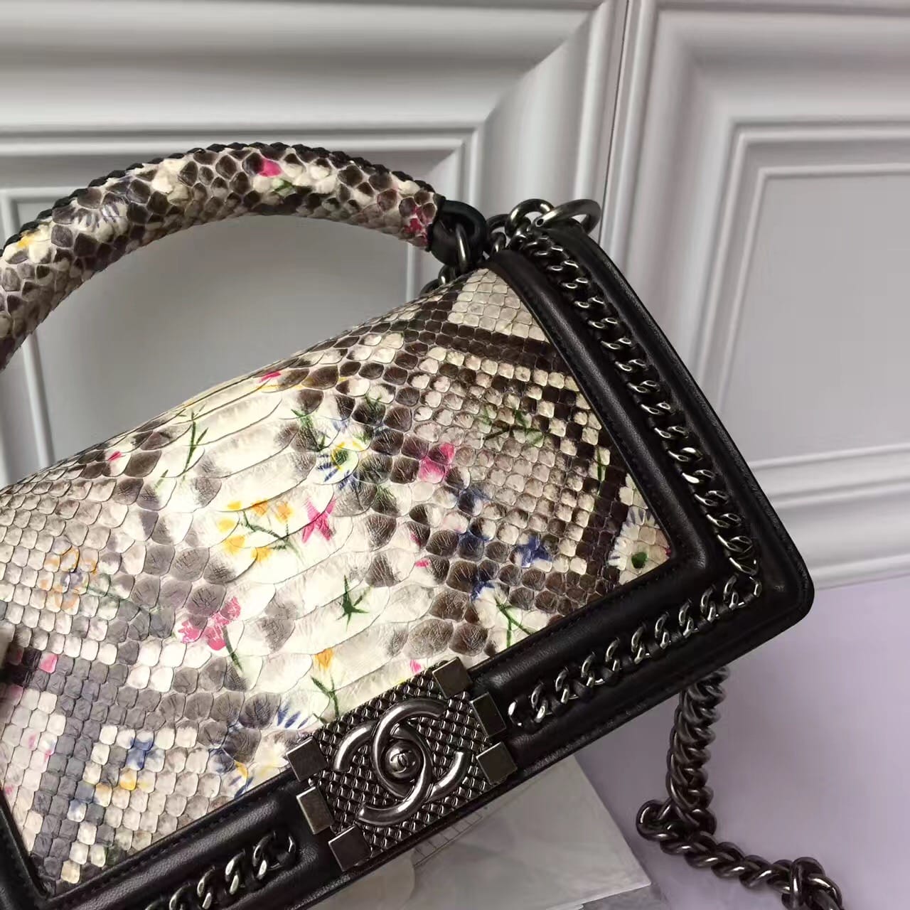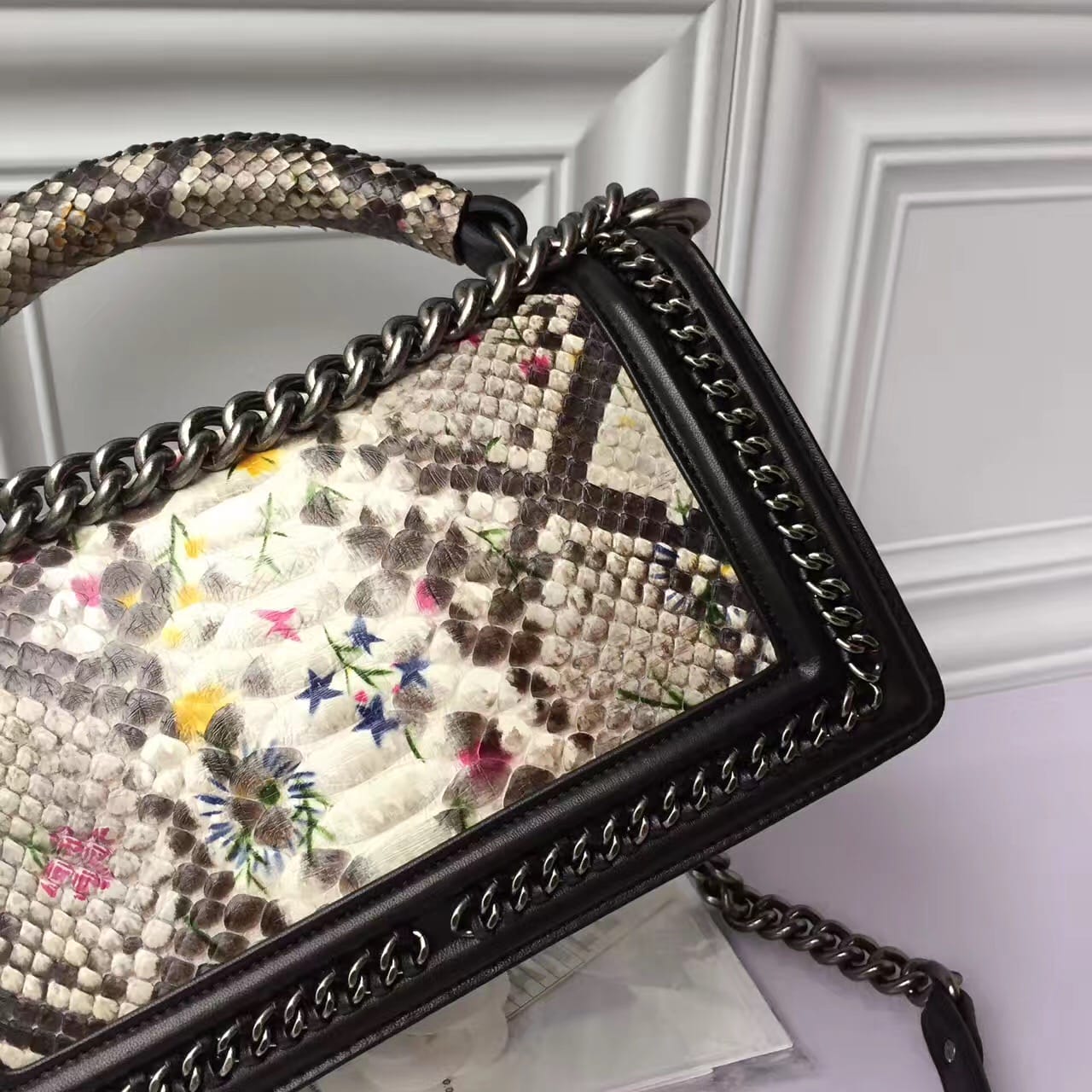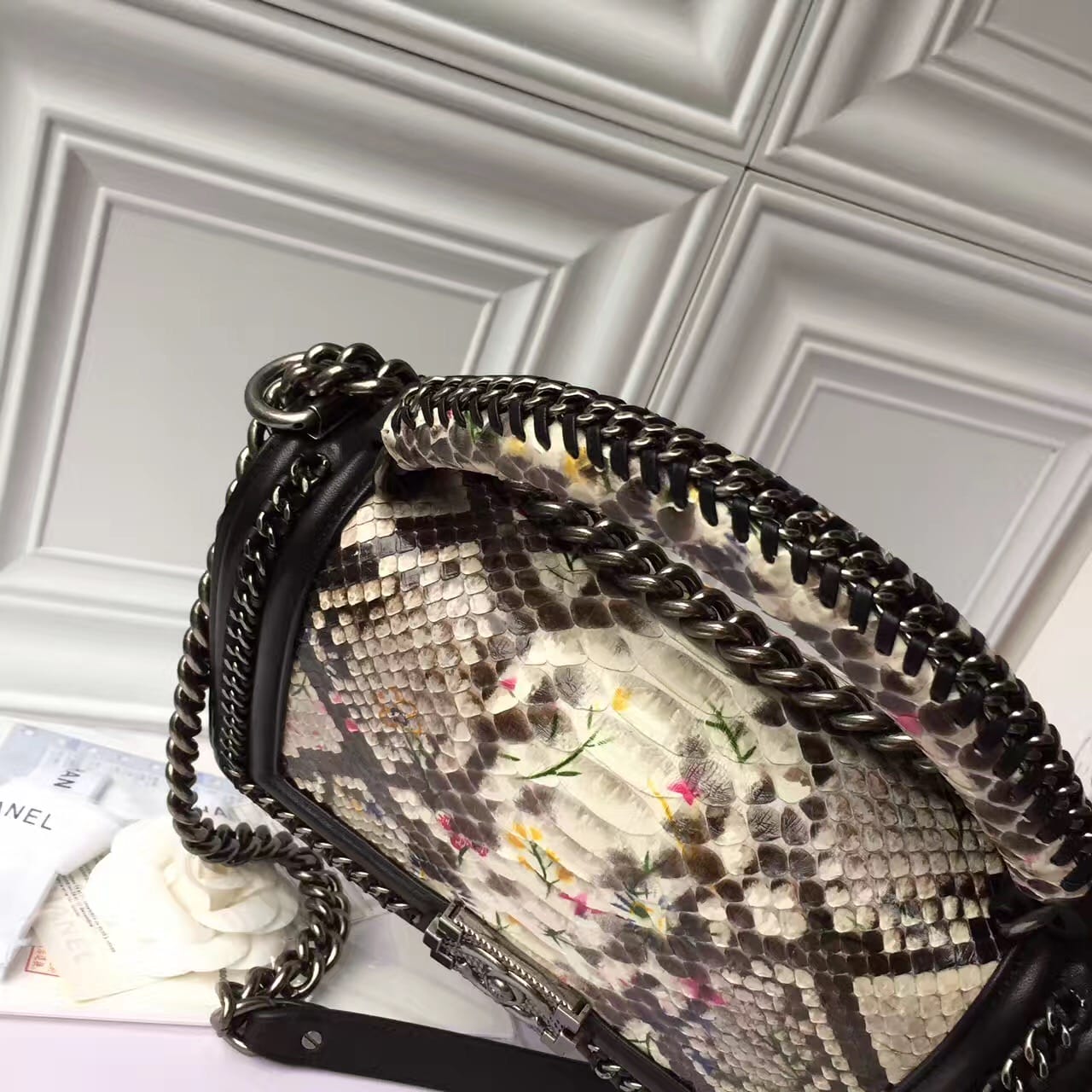 香奈儿 非洲进口野生蟒蛇皮配羊皮内花卉金色金属女士斜挎包