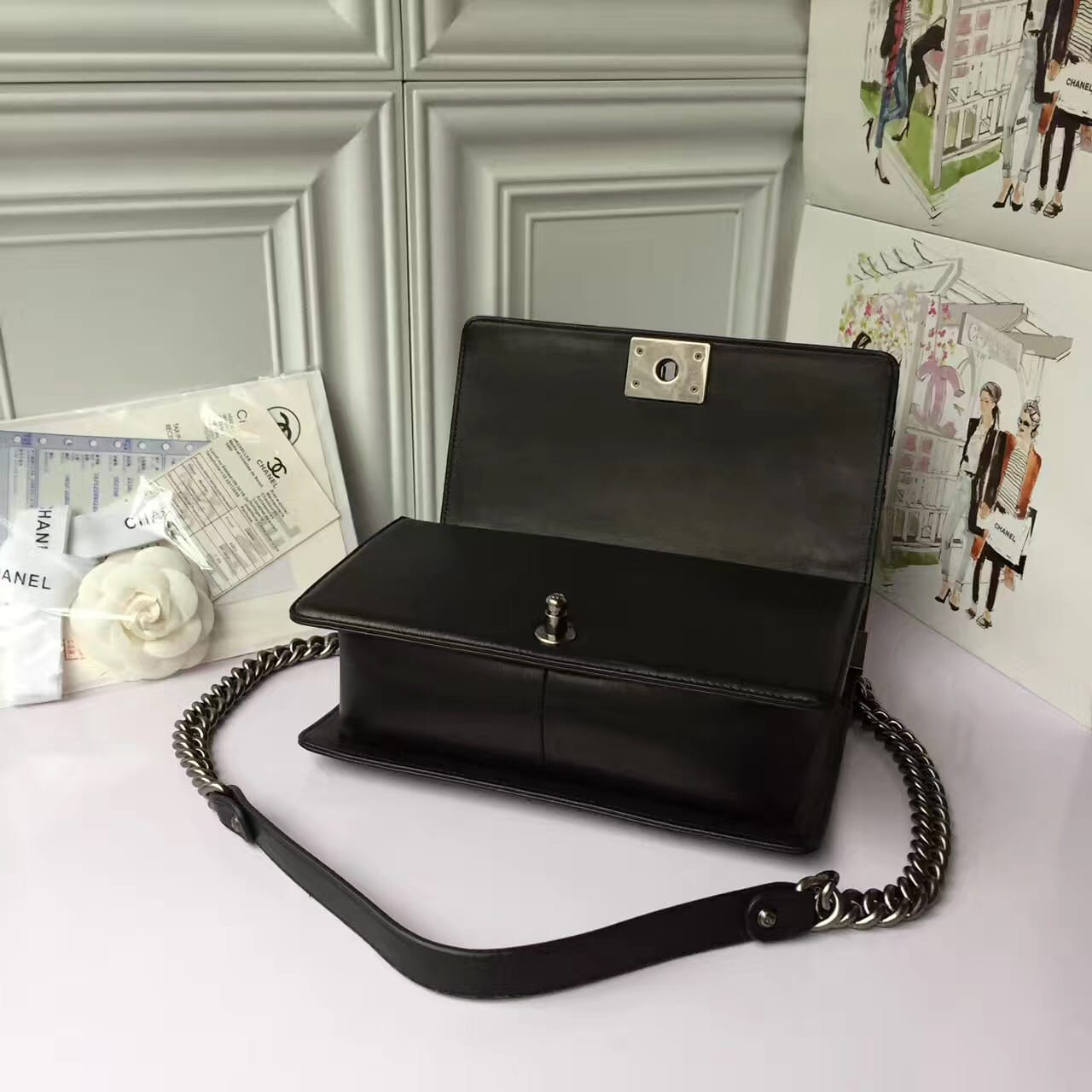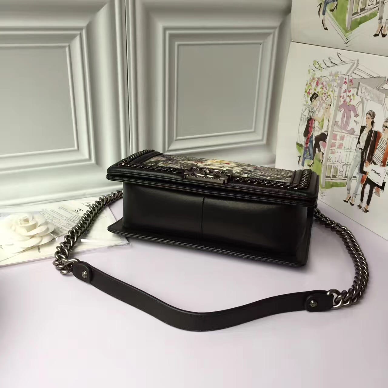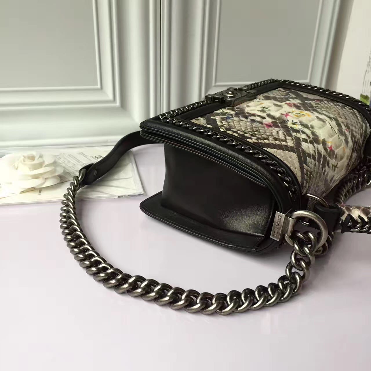 香奈儿 非洲进口野生蟒蛇皮配羊皮内花卉金色金属女士斜挎包