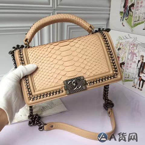 香奈儿 野生蟒蛇皮配羊皮肉色 金色金属女士斜挎包