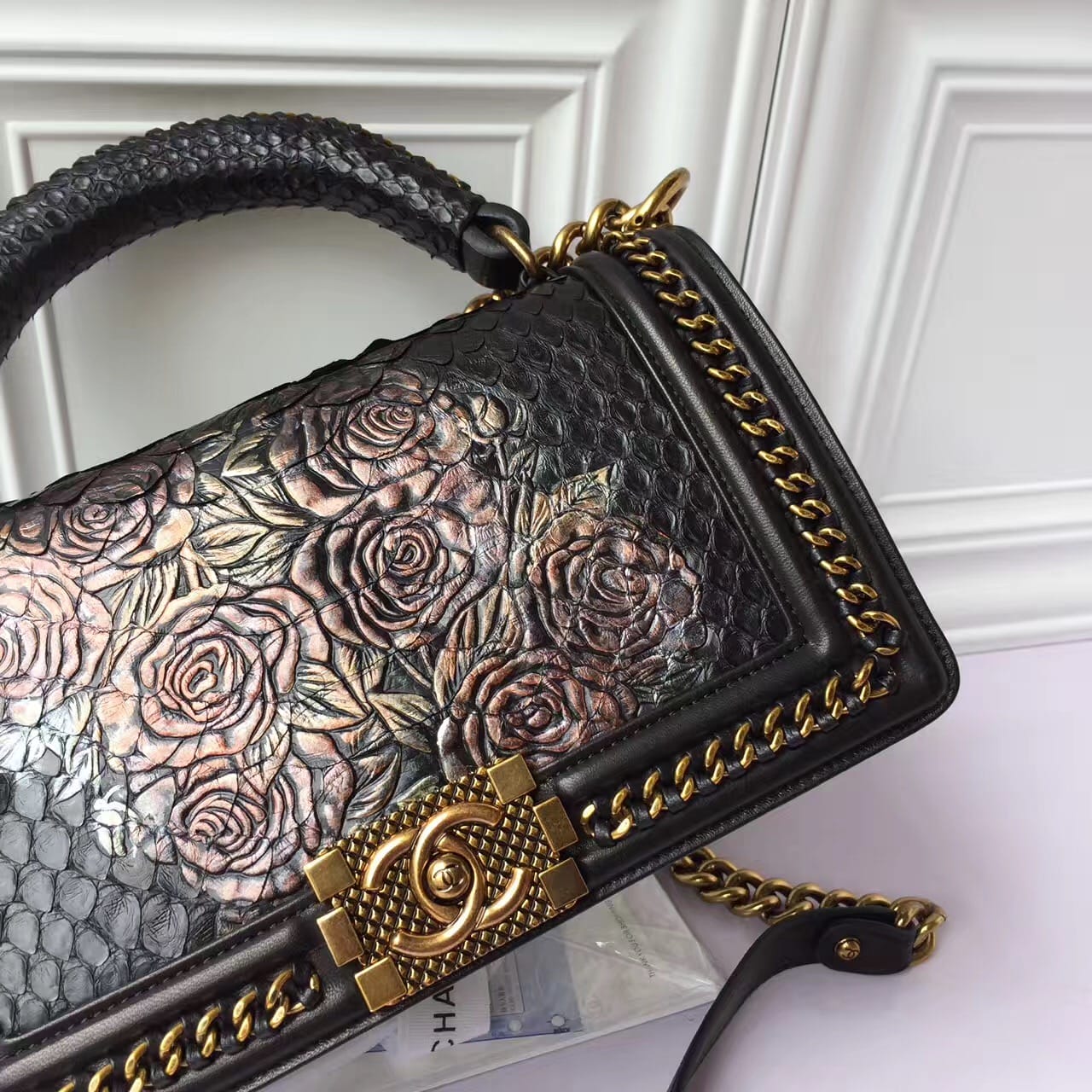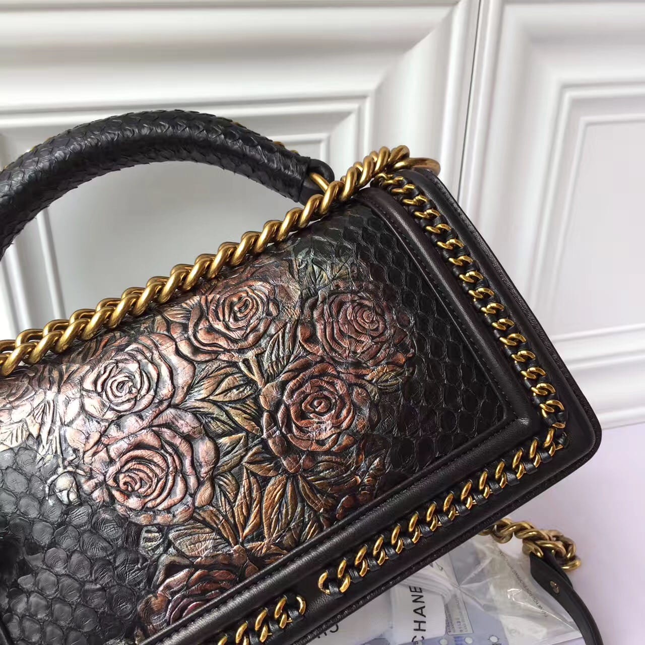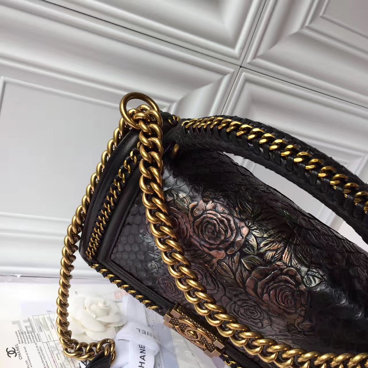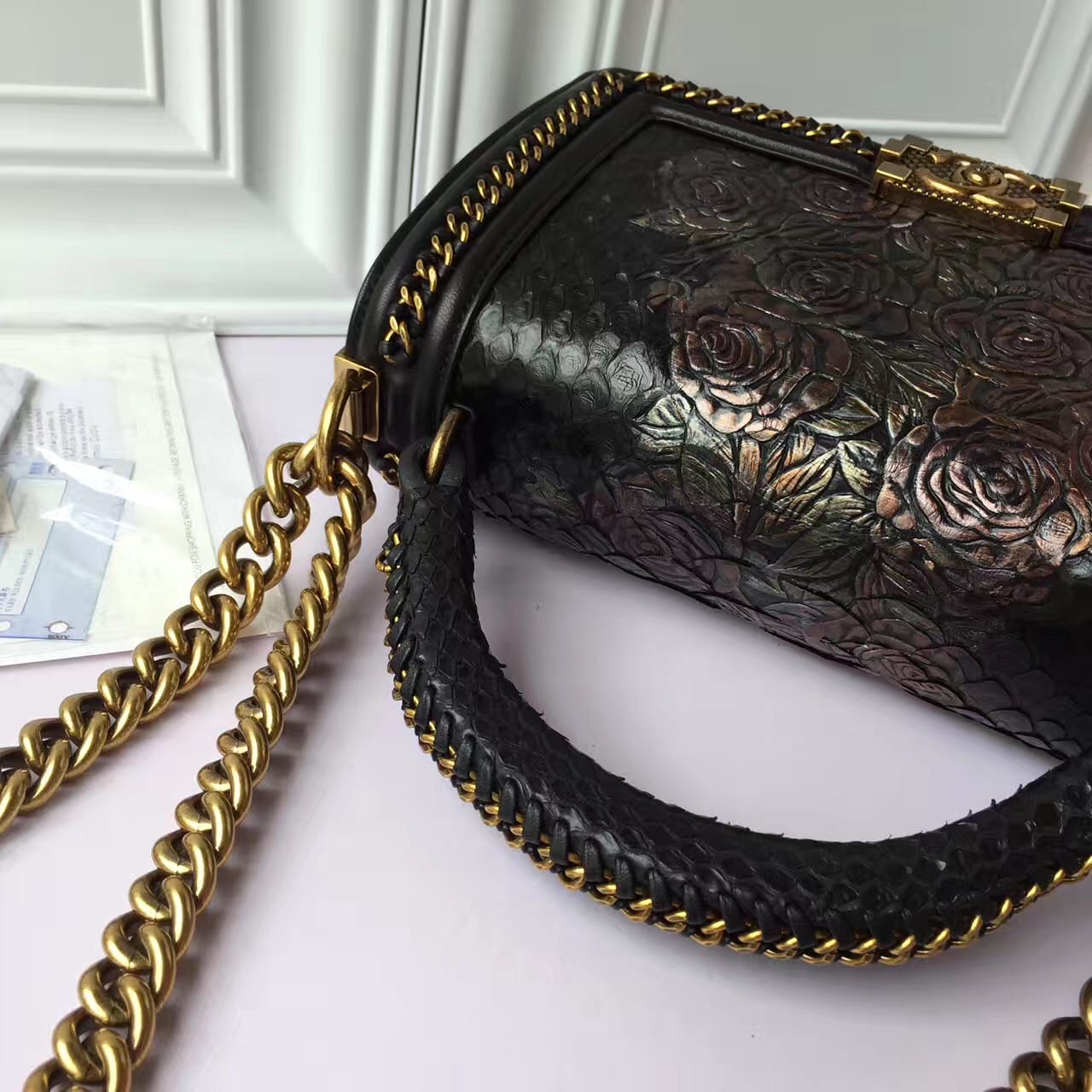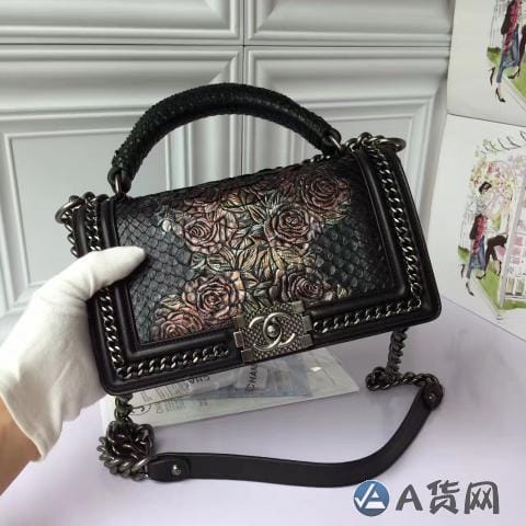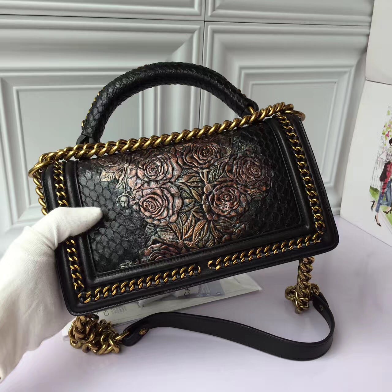 香奈儿 蟒蛇皮黑色 玫瑰印花金色金属女士斜挎包
