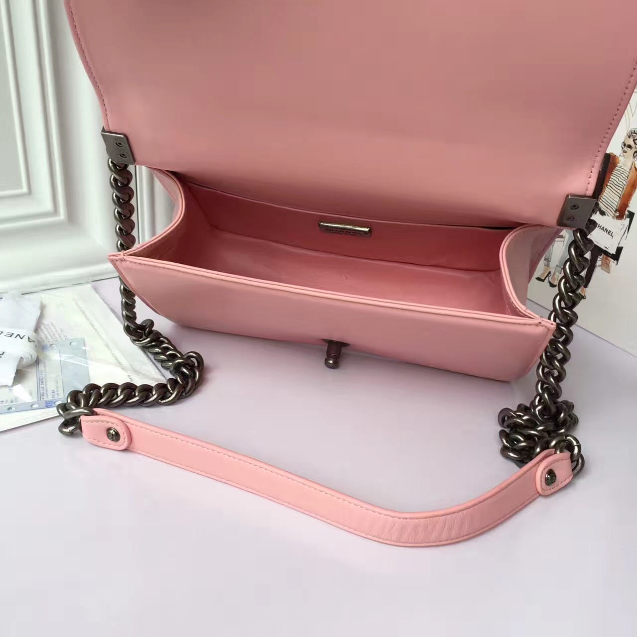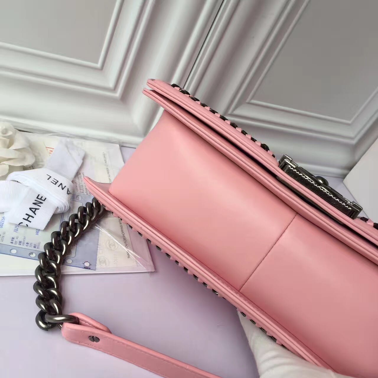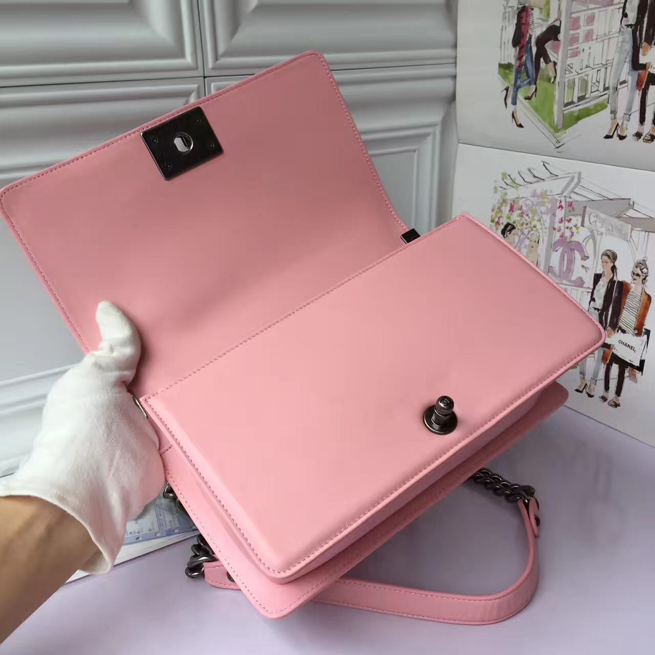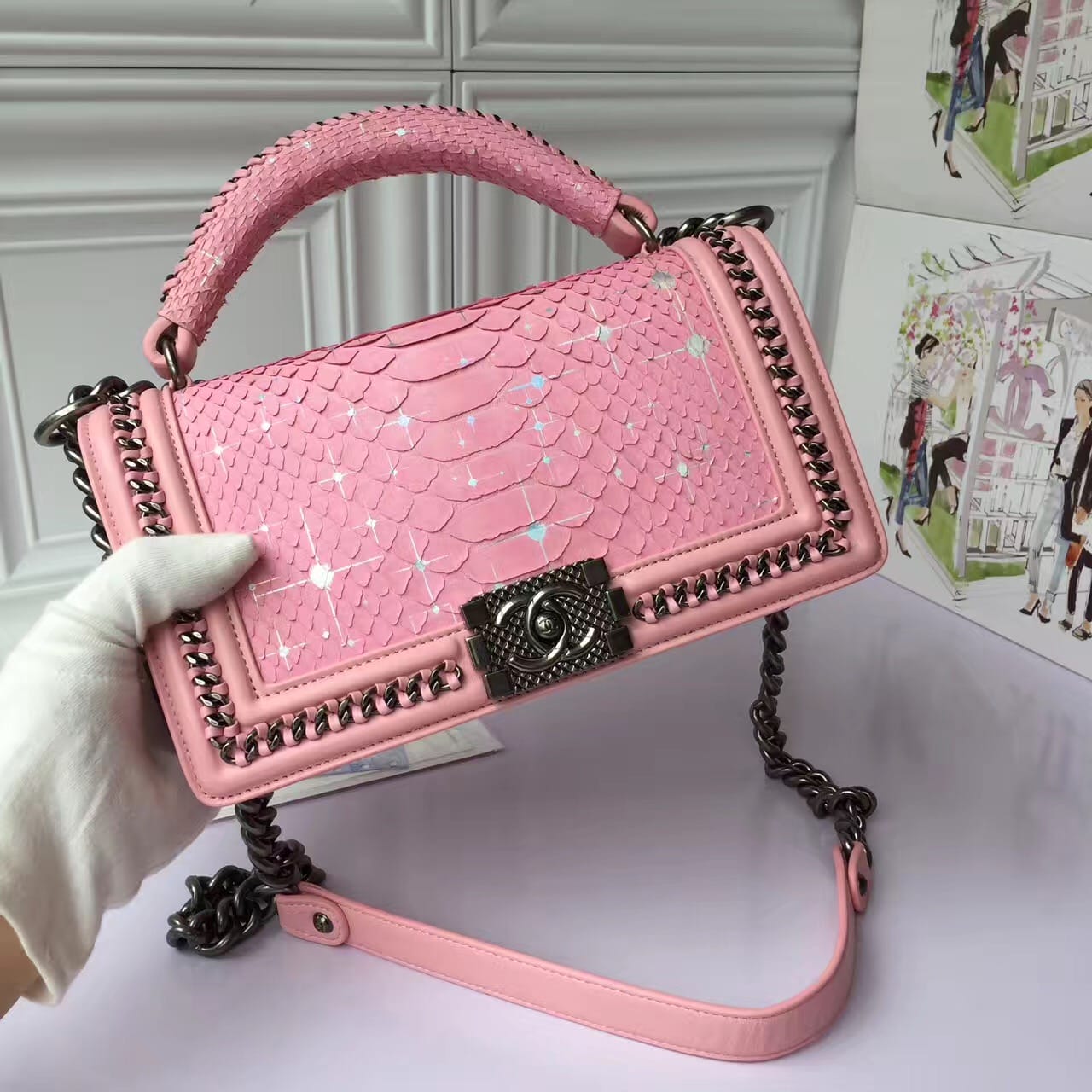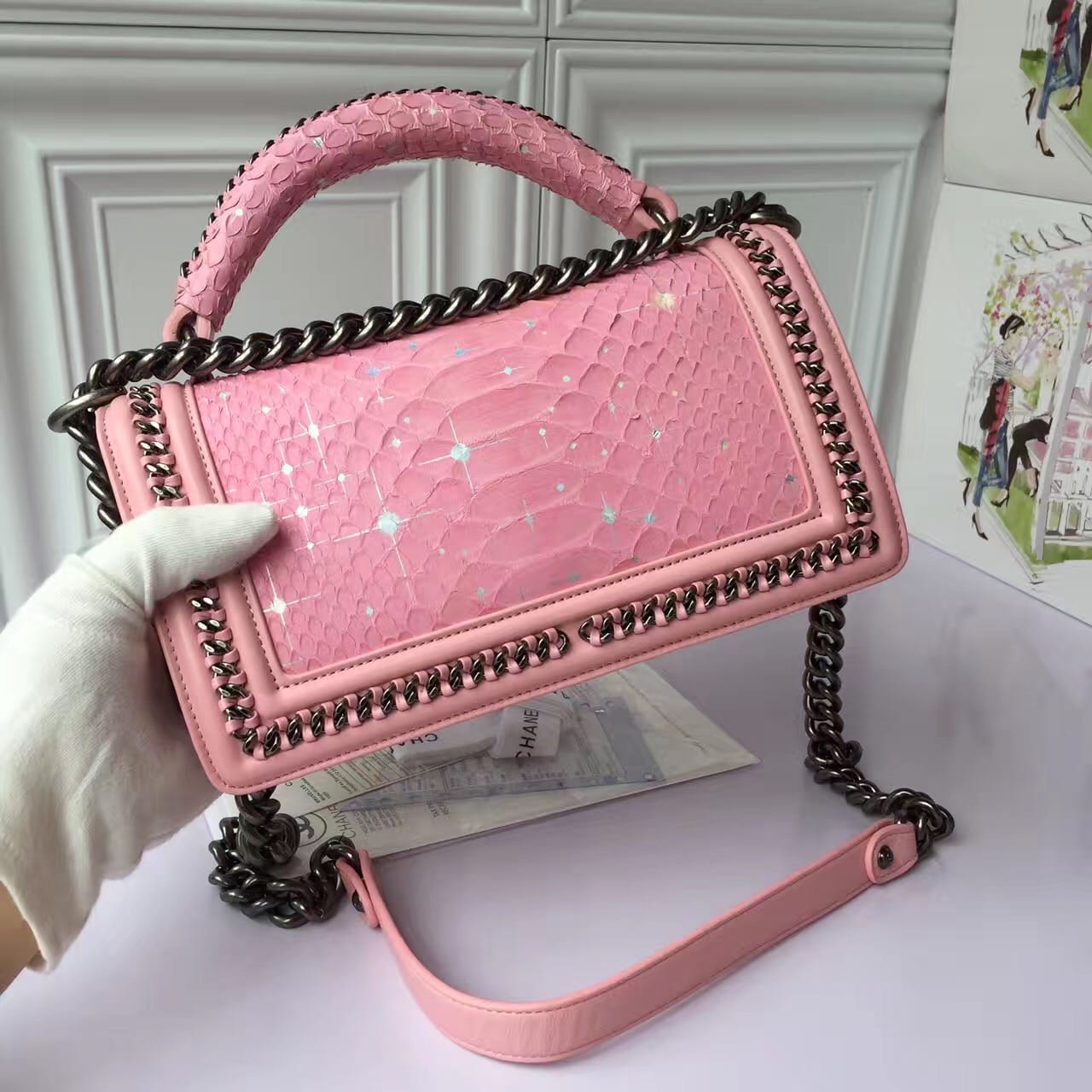 香奈儿 粉色女士穿孔 涂鸦女士斜挎包