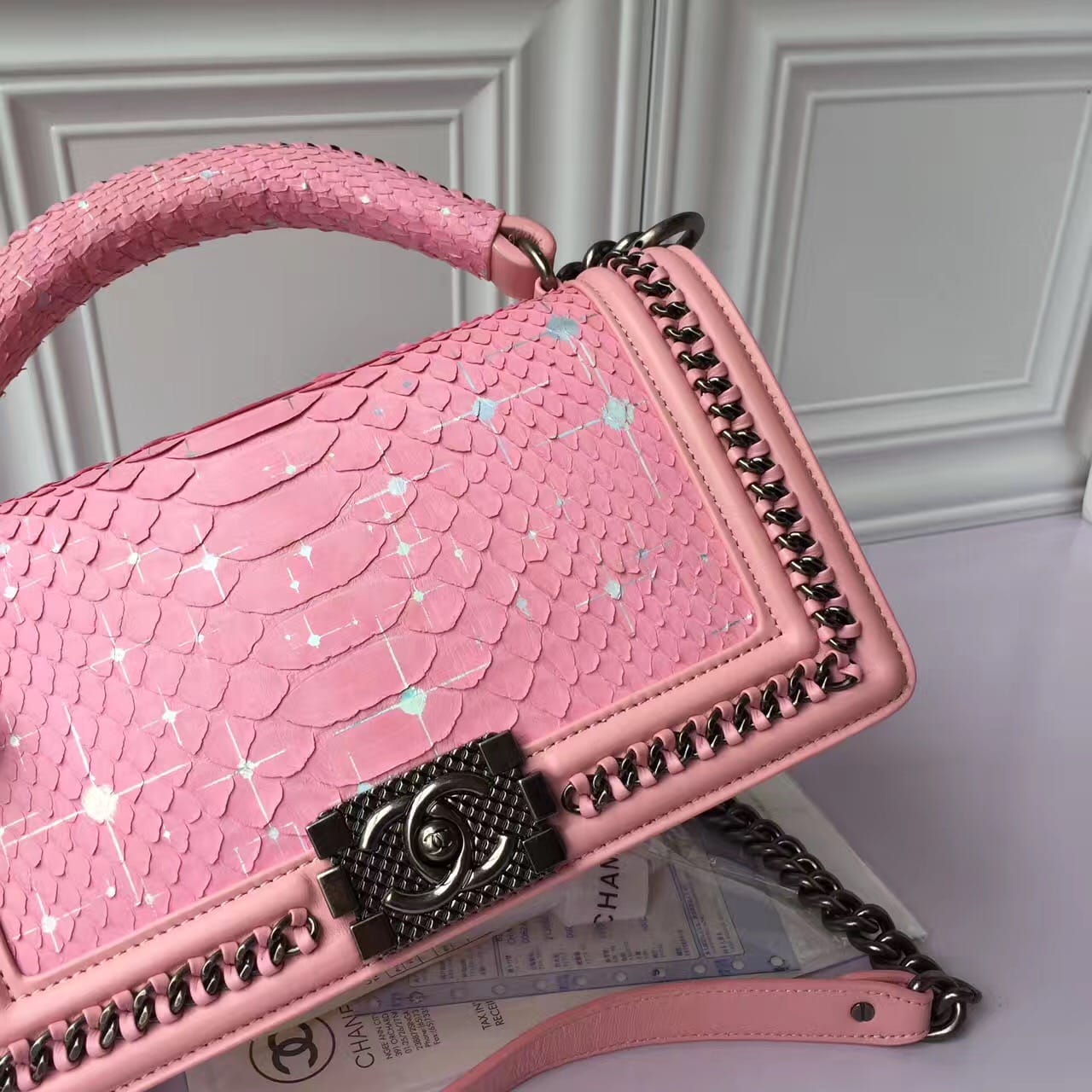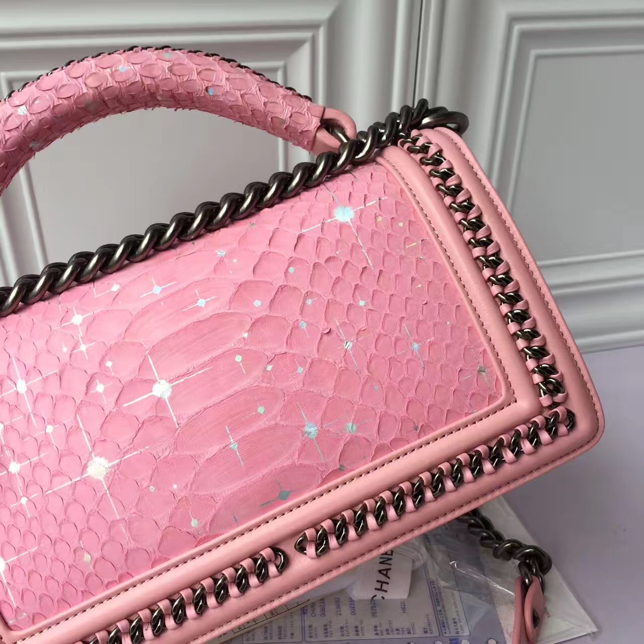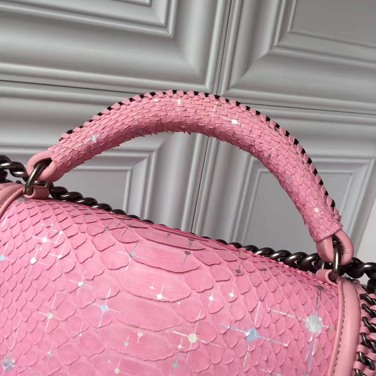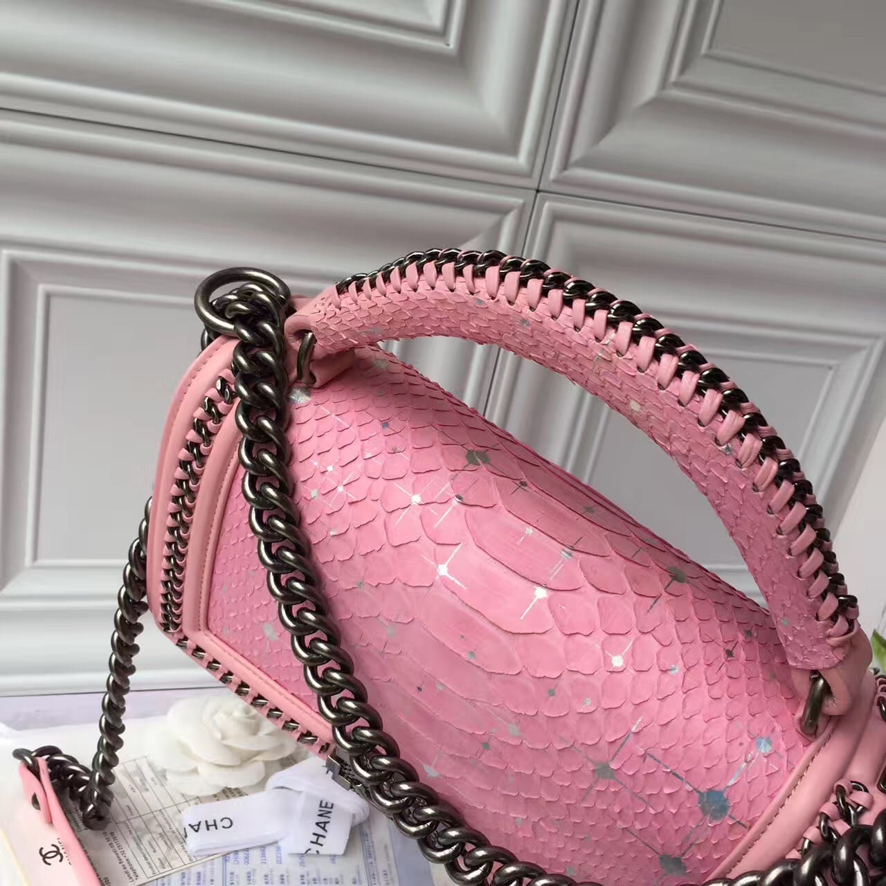 Chanel香奈儿蟒蛇皮萨尔茨堡系列出货非洲进口野生蟒蛇皮配羊皮内里进口古银五金,和精美编织搭配,精致的做工 严谨的工序无与伦比的搭配 每一个包的蛇皮都是精心细选 每一个包都是经过上百道工序细心才能完成的,尺寸:25cm!