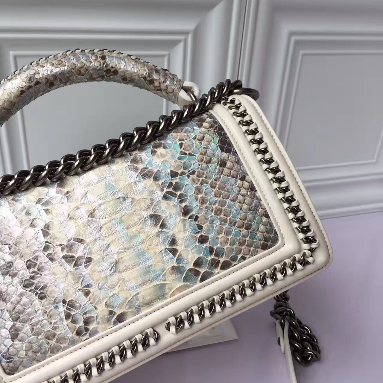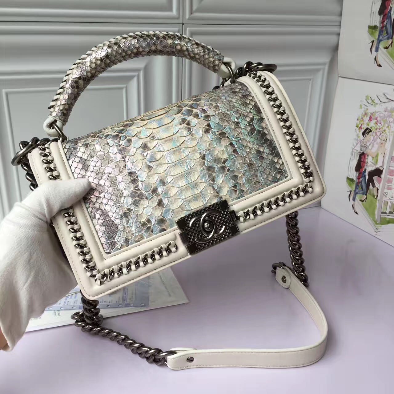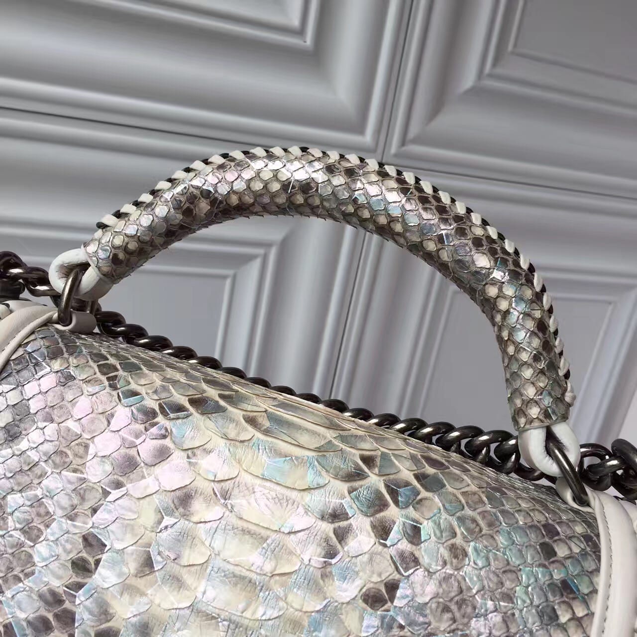 Chanel香奈儿蟒蛇皮萨尔茨堡系列出货非洲进口野生蟒蛇皮配羊皮内里进口古银五金,和精美编织搭配,精致的做工 严谨的工序无与伦比的搭配 每一个包的蛇皮都是精心细选 每一个包都是经过上百道工序细心才能完成的,尺寸:25cm!