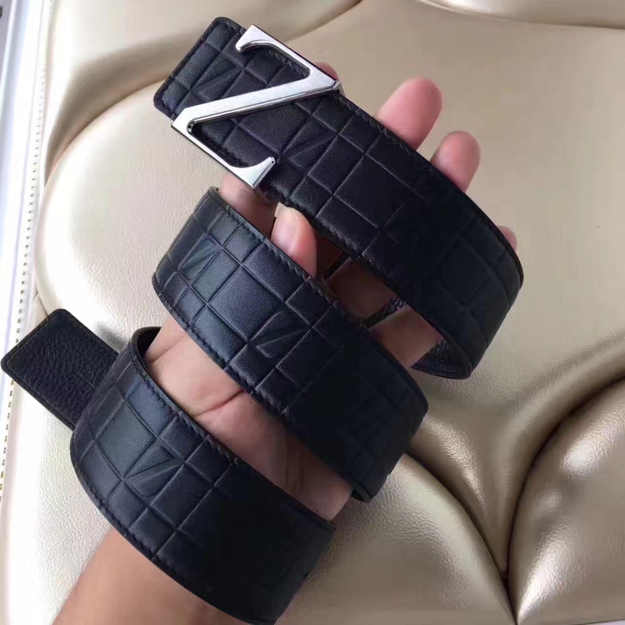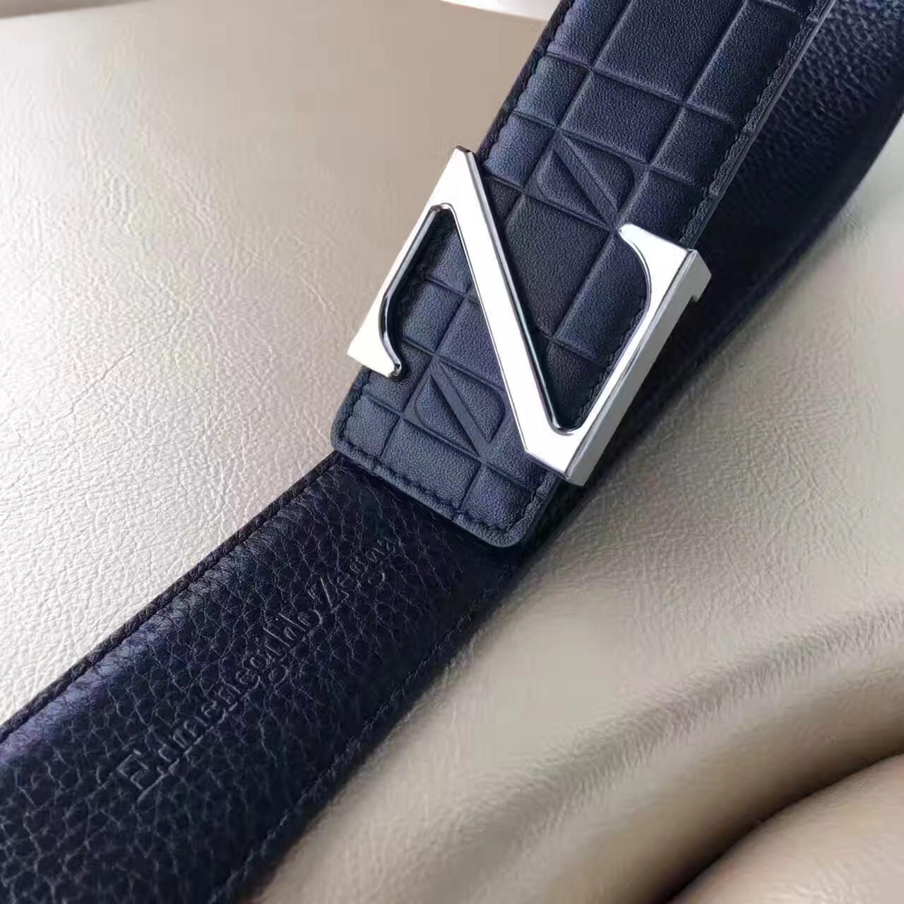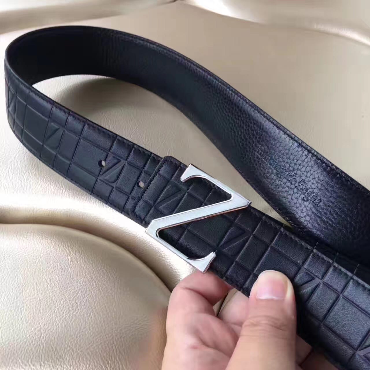 杰尼亚 Z字头 头层牛皮格纹压花 男士腰带